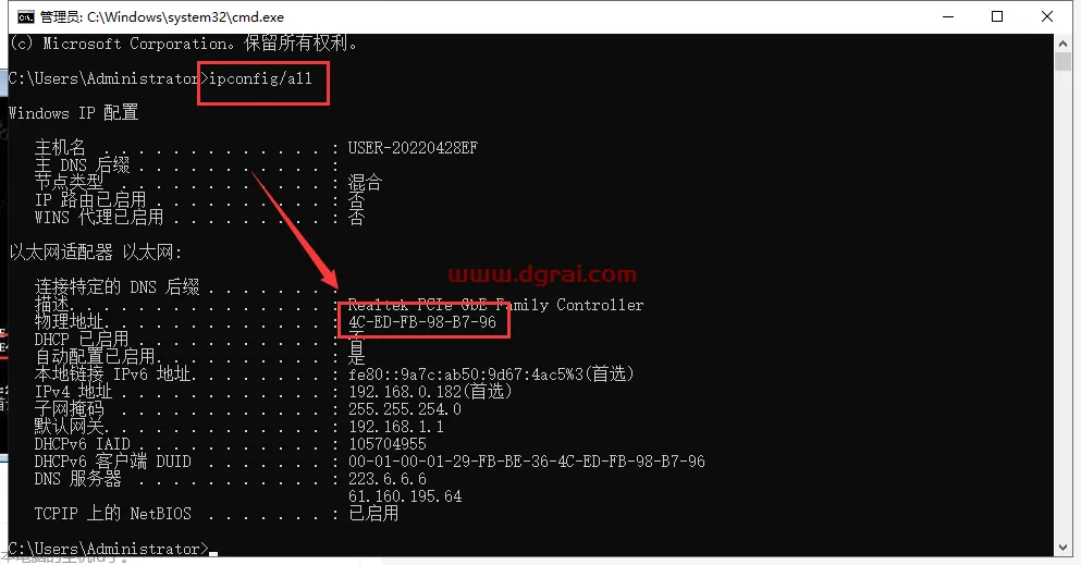 在开始菜单里面搜索cmd打开运行,然后再输入ipconfig/all回车键,下面就是本电脑的主机id了。