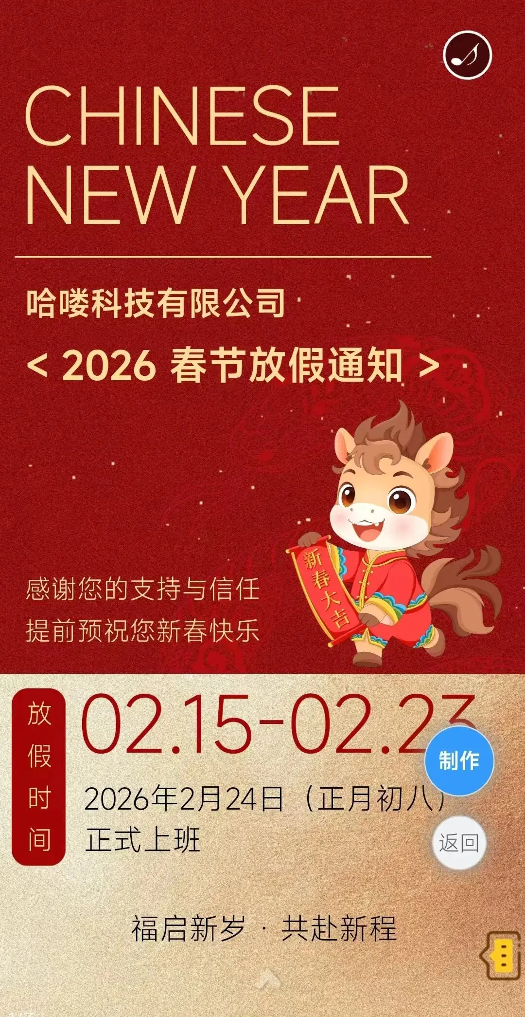 如果想让春节放假通知更有记忆点,动画视频绝对是 “加分项”。动态画面 + 音效的组合,能打破文字的枯燥,让放假信息在趣味中传递,还能借机展现企业文化,拉近距离。