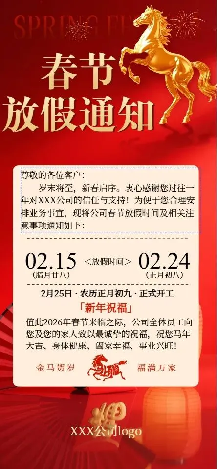 单张图片模板适合追求简洁高效、快速传播的企业;动画视频模板适合注重品牌形象、想传递温度的企业;互动链接模板适合需要传递详细信息、兼顾实用性的企业。无论选择哪种形式,核心都是 “信息清晰 + 氛围到位 + 品牌融合”。春节放假通知不仅是一份工作告知,更是企业与员工的情感连接。希望这3 种2026春节放假通知模板制作指南,能帮你打造出既吸睛又实用的春节放假通知,让员工带着满满的祝福开启假期,年后以更饱满的状态回归工作!