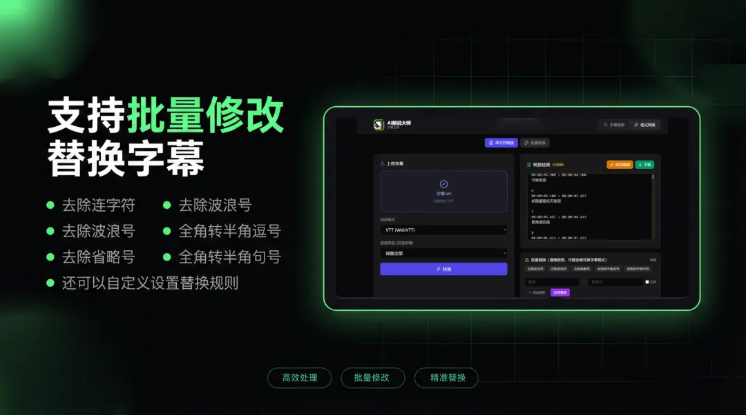 A:还支持批量修改字幕内容,比如去除连字符、波浪号、省略号,全角标点转半角,以及自定义替换规则,可以批量修正错别字或统一角色译名。