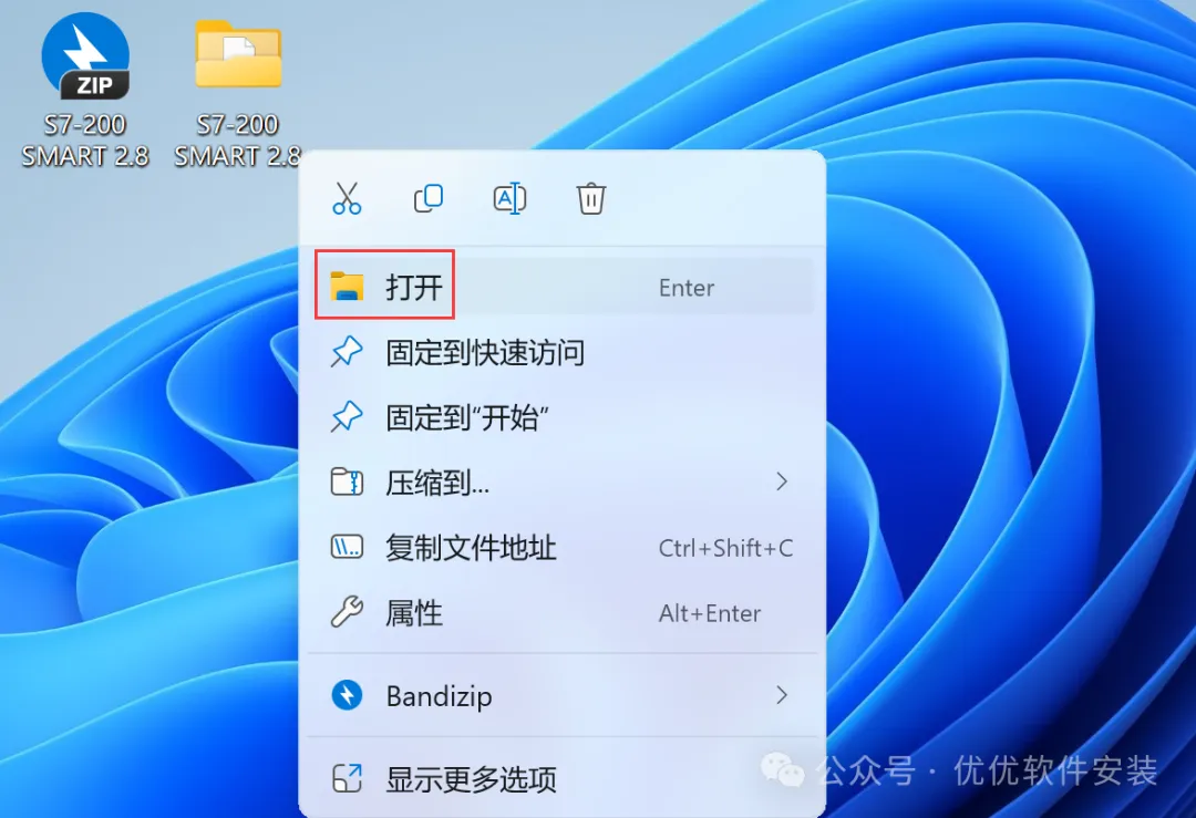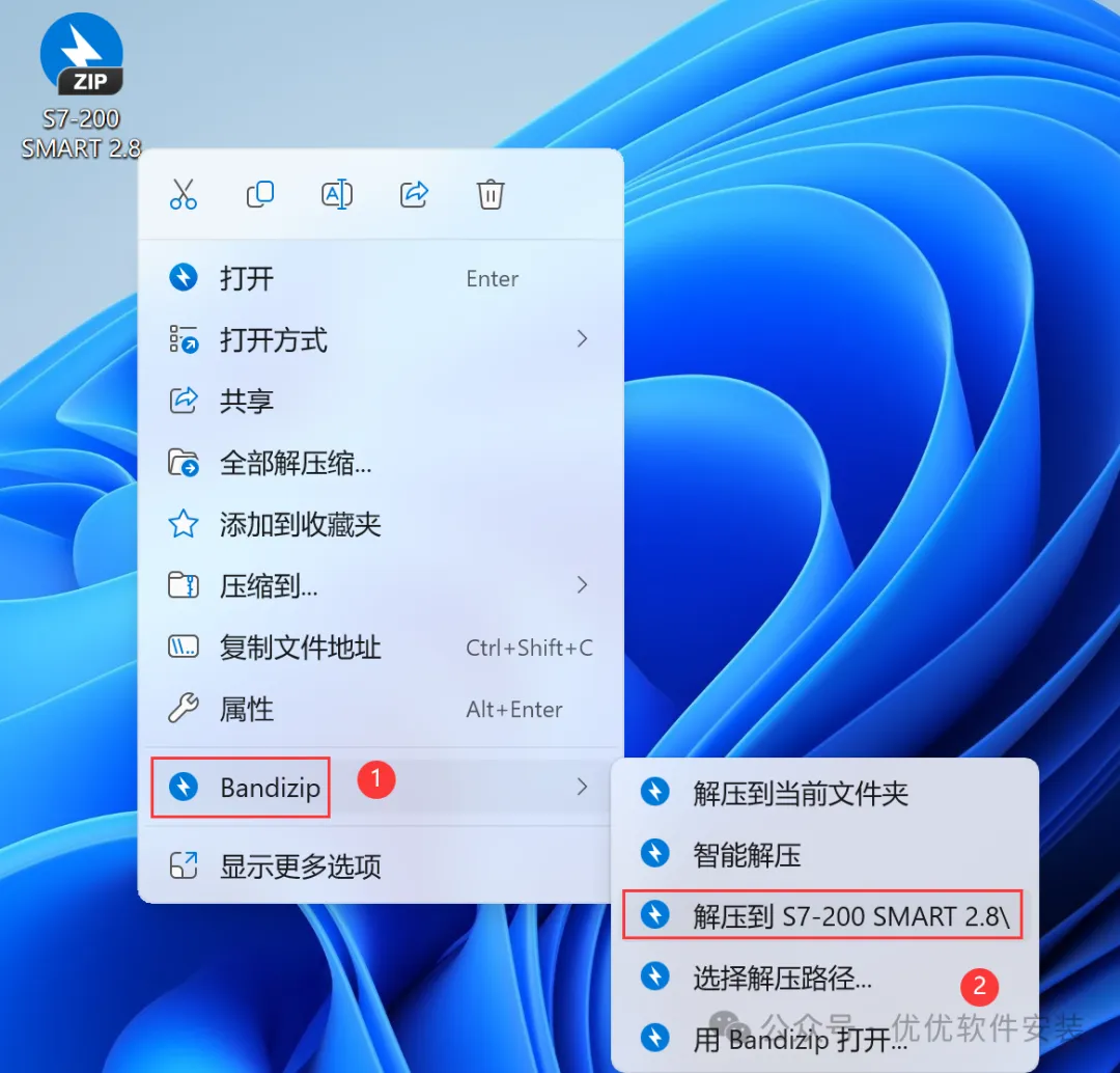 1、下载S7-200 SMART 2.8软件安装包到电脑上,右键选择【解压到S7-200 SMART 2.8\】