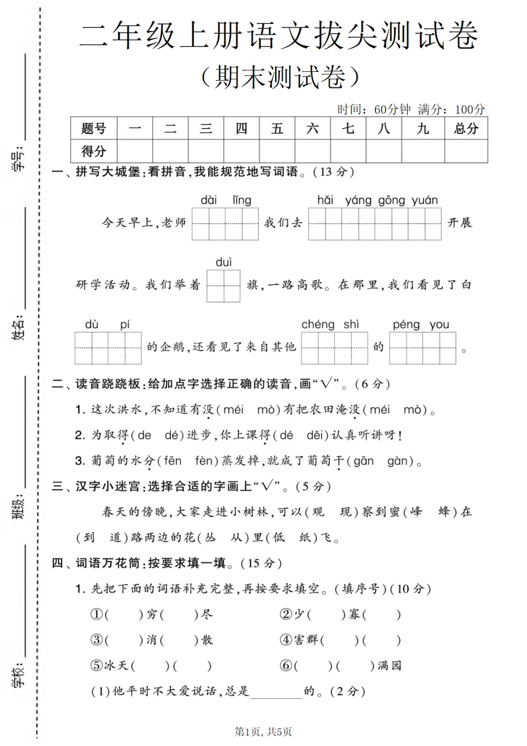 二年级上语文期末拔尖测试卷2(5页)
