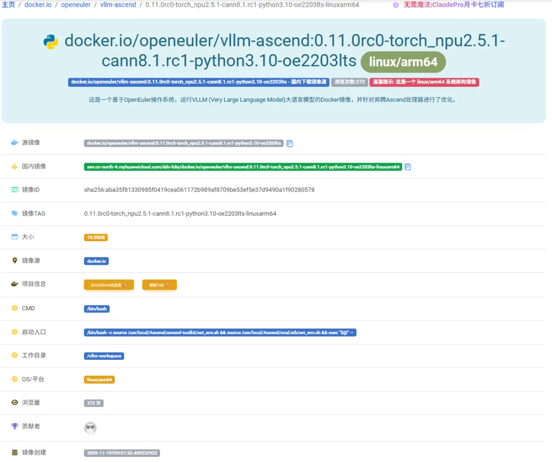 之前安利过这个网站,其实挺好用的.https://docker.aityp.com/ 官方介绍: 欢迎大家使用渡渡鸟的容器镜像小站! 本站镜像100%同步自官方镜像!请大家放心使用。 本站目前支持同步镜像源: gcr.io ghcr.io quay.io k8s.gcr.io docker.io registry.k8s.io docker.elastic.co skywalking.docker.scarf.sh mcr.microsoft.com 单个镜像大小限制2G操作方法为: 比如我想搜寻下一年 etcd的镜像 直接搜索 etcd就可以. 然后任意点开一个来源: 会发现会有如此配置: 源镜像 registry.k8s.io/etcd:3.5.9-0 国内镜像 swr.cn-north-4.myhuaweicloud.com/ddn-k8s/registry.k8s.io/etcd:3.5.9-0 镜像ID sha256:73deb9a3f702532592a4167455f8bf2e5f5d900bcc959ba2fd2d35c321de1af9 镜像TAG 3.5.9-0 大小 294.02MB 镜像源 registry.k8s.io 同步时间 2024-08-14 14:11 更新时间 2025-04-23 19:15 开放端口 2379/tcp 2380/tcp 4001/tcp 7001/tcp 其实这个镜像源不仅仅是寻找, 还有一些版本信息和端口信息非常值得使用.如果我想pull vllm 可以如下处置: 使用之前案例过的网站搜索: 渡渡鸟镜像站 https://docker.aityp.com/ 可以使用公司里的机器进行下载 docker pull swr.cn-north-4.myhuaweicloud.com/ddn-k8s/docker.io/vllm/vllm-openai:v0.15.0然后 docker tag swr.cn-north-4.myhuaweicloud.com/ddn-k8s/docker.io/vllm/vllm-openai:v0.15.0 vllm/vllm-openai:v0.15.0如果是鲲鹏+昇腾的可能需要下载这一个: swr.cn-north-4.myhuaweicloud.com/ddn-k8s/docker.io/openeuler/vllm-ascend:0.11.0rc0-torch_npu2.5.1-cann8.1.rc1-python3.10-oe2203lts-linuxarm64