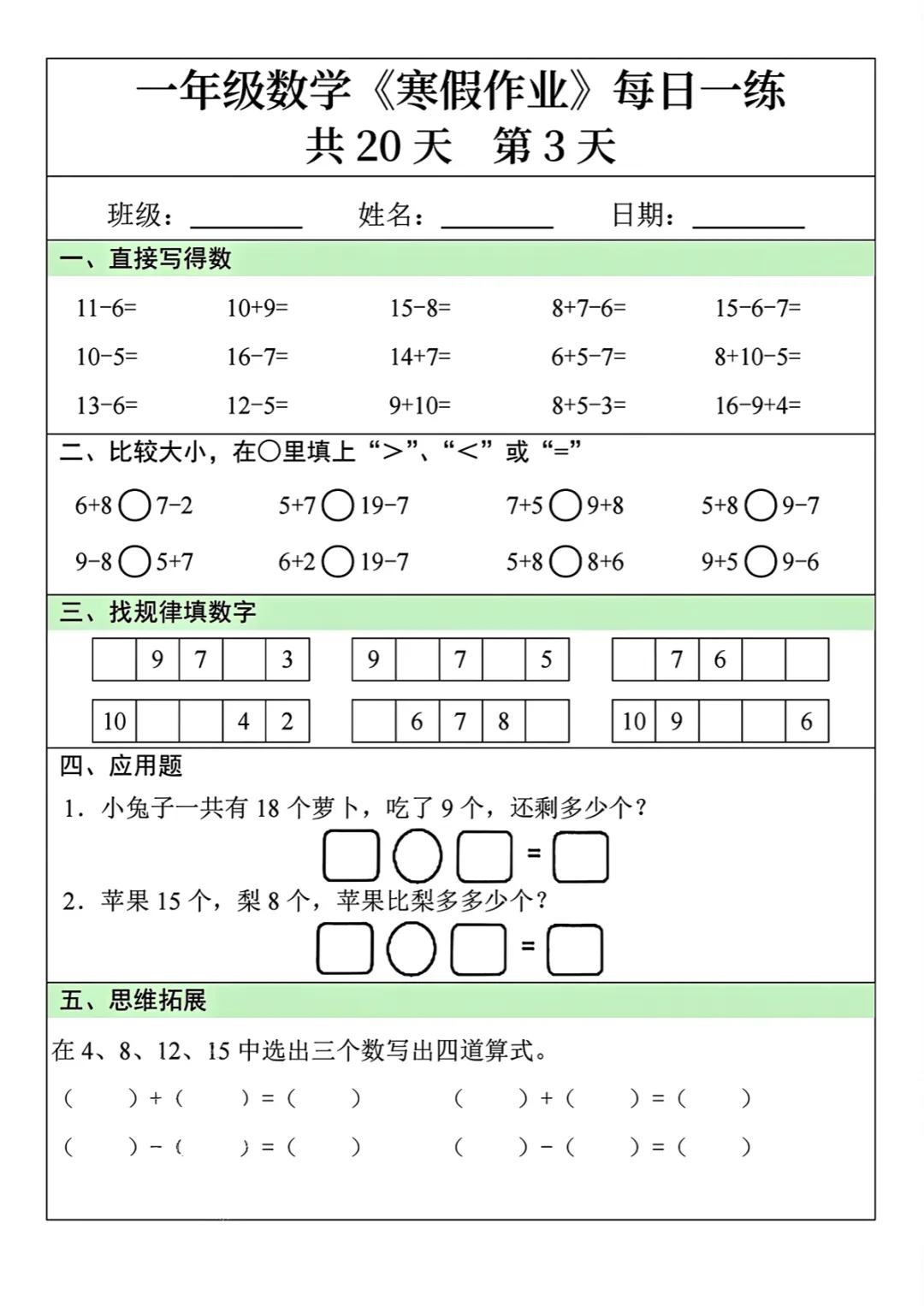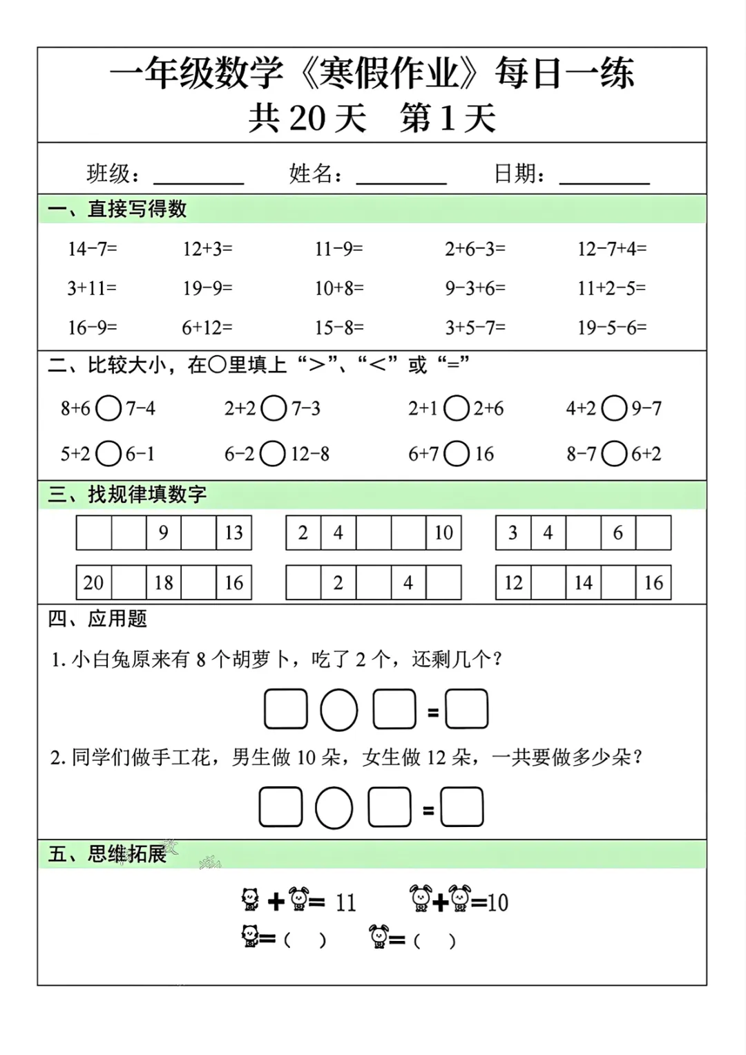 一年级(下)数学 《寒假作业》每日一练