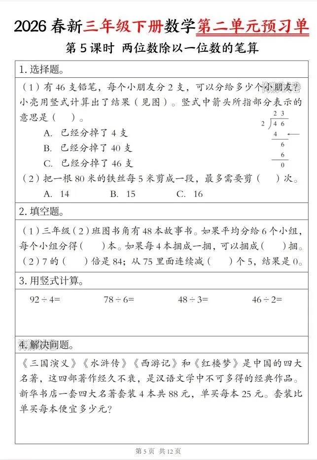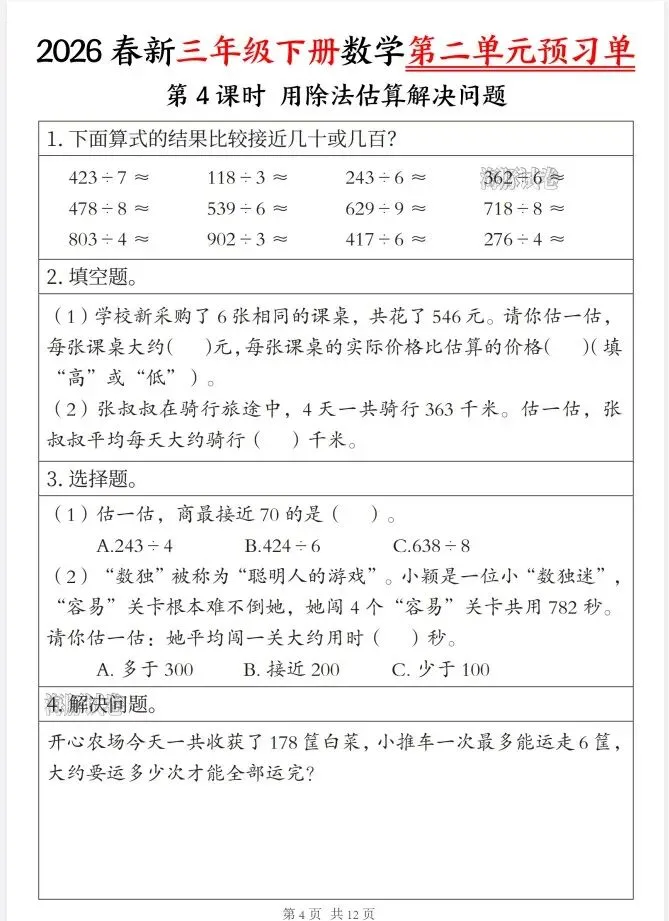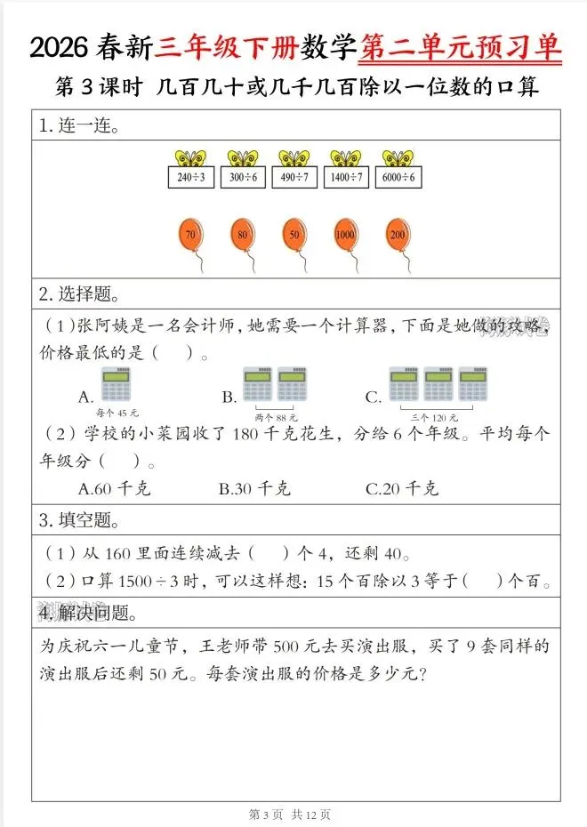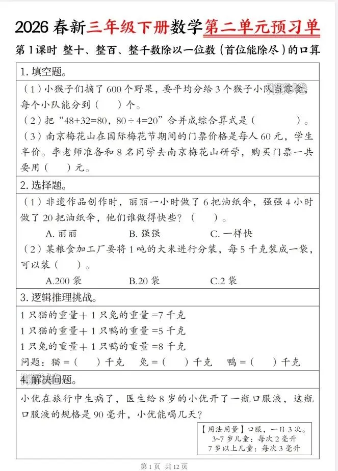 今天给大家整理了26春三年级数学下册第二单元预习单,转发给朋友或班级群,受益更多人,帮助孩子学习!