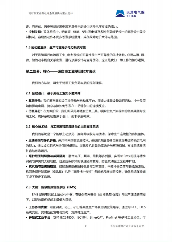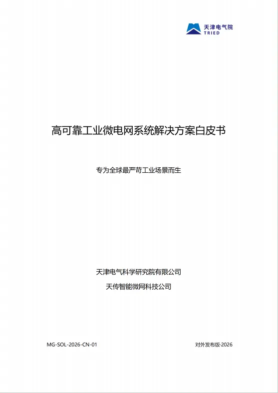 天津电气科学研究院有限公司旗下天传智能微网科技公司近日发布《高可靠工业微电网系统解决方案白皮书(2026)》,提出一套深度融合工业工艺逻辑与现代能源技术的系统性解决方案,重新定义“电力可靠”的行业标准。