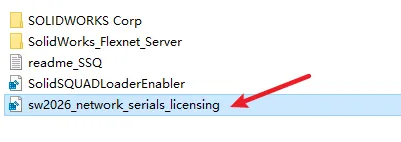 2.打开刚刚解压的文件夹,双击打开”Crack“文件夹,双击运行”sw2026_network_serials_licensing.reg“注册表文件