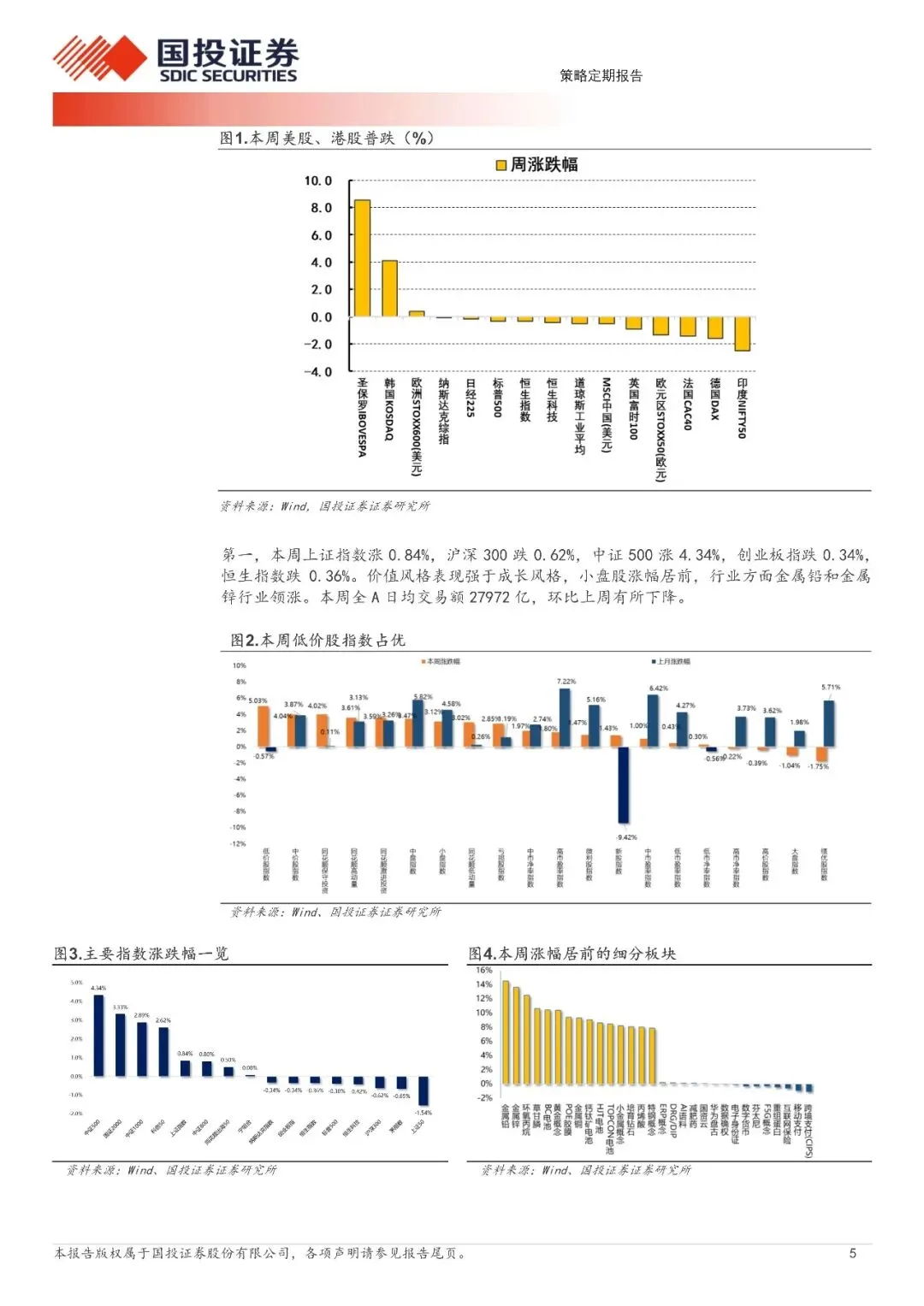 本周上证指数涨 0.84%,沪深 300 跌 0.62%,中证 500 涨 4.34%,创业板指跌 0.34%。价值风格表现强于成长风格,小盘股涨幅居前。本周全 A 日均交易额 27972 亿,环比上周有所下降。基于历史跨年行情的统计,跨年期间 5%涨幅可以因情绪而涨,5-10%可以因增量资金而涨,但 10%以上涨幅则需要明确的逻辑(政策、宏观流动性宽松或中美经济共振等)”。