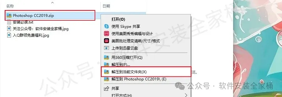 1.右键点击【photoshop CC2019】安装程序,【解压到当前文件夹】。