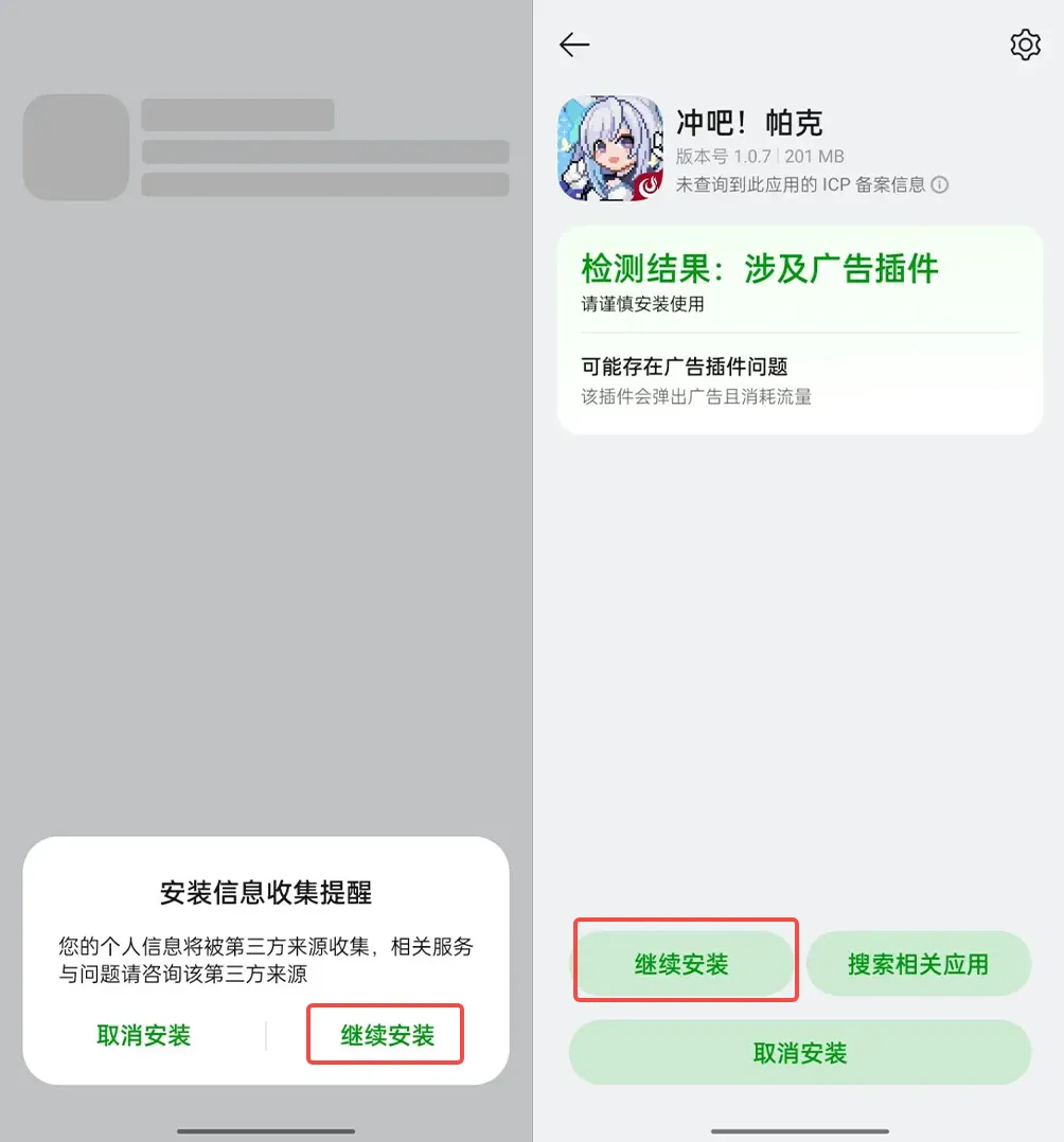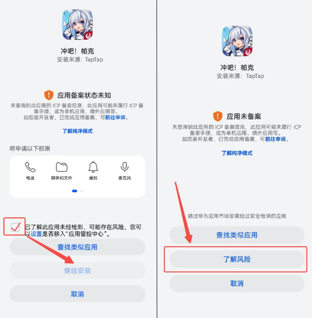 安装过程中,若出现下图左边所示拦截,请【勾选】已了解选项,点击【继续安装】即可完成官方安全稳定包体的下载~