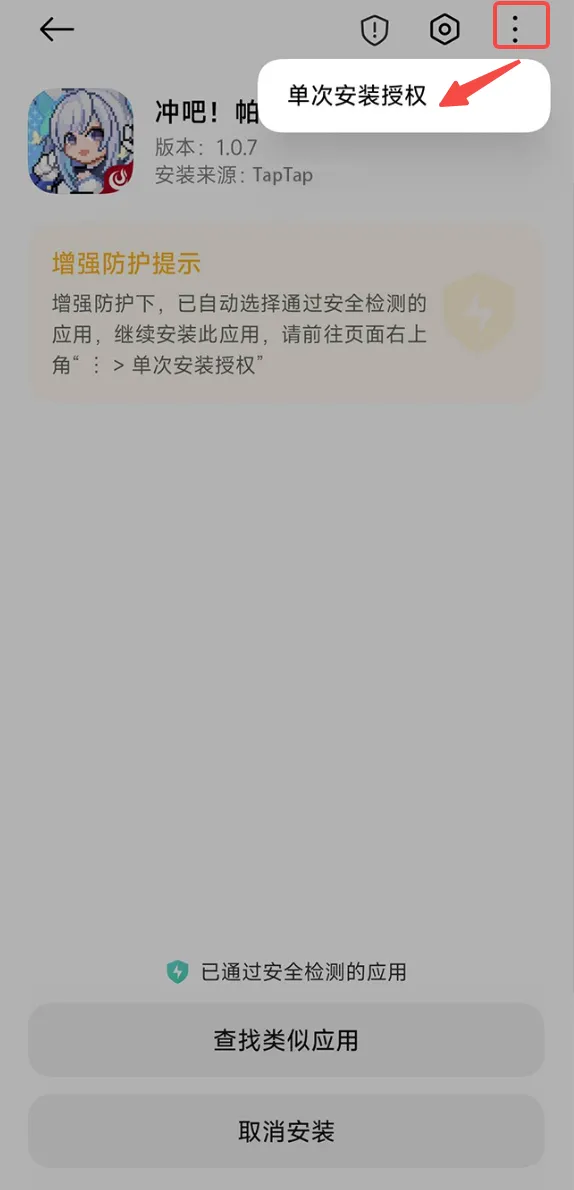 1、关闭超级守护后,通过TapTap下载《冲吧!帕克》,点击以下弹窗【下载】按钮即可完成下载,之后点击【允许本次安装】