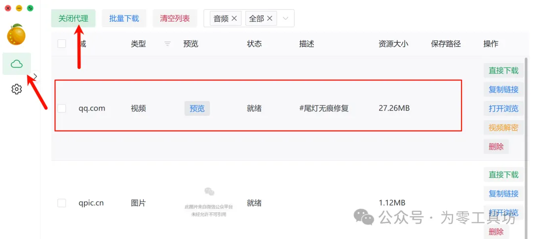 4.点击左边的小云朵然后保持开启代理状态。不一会儿我们要下载的视频就出现在我们眼前(