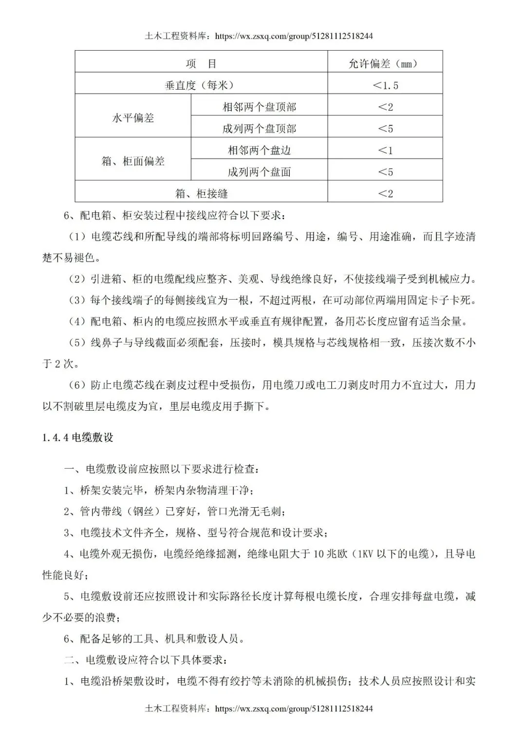 - 电缆敷设:规定敷设前检查、电缆排列固定、标识及成品保护