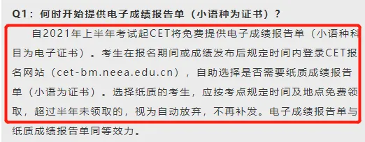 自2021年上半年考试起CET将免费提供电子成绩报告单(小语种科目为电子证书)。考生在报名期间或成绩发布后规定时间内登录CET报名网站(cet-bm.neea.edu.cn),自助选择是否需要纸质成绩报告单(小语为证书)。选择纸质的考生,应按考点规定时间及地点免费领取,超过半年未领取的,视为自动放弃,不再补发。电子成绩报告单与纸质成绩报告单同等效力。Q2:为什么无法查询到我的成绩报告单(小语种为证书)?