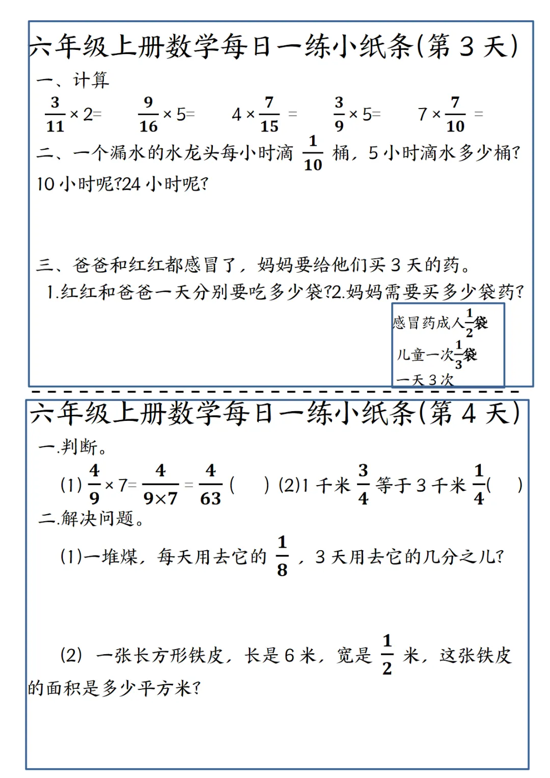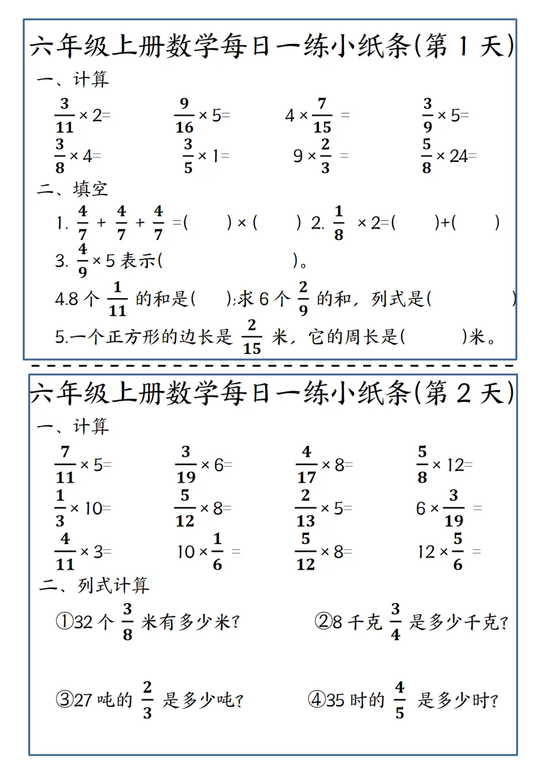 >【免费下载】六年级上数学每日一练小纸条,PDF电子版,可打印
