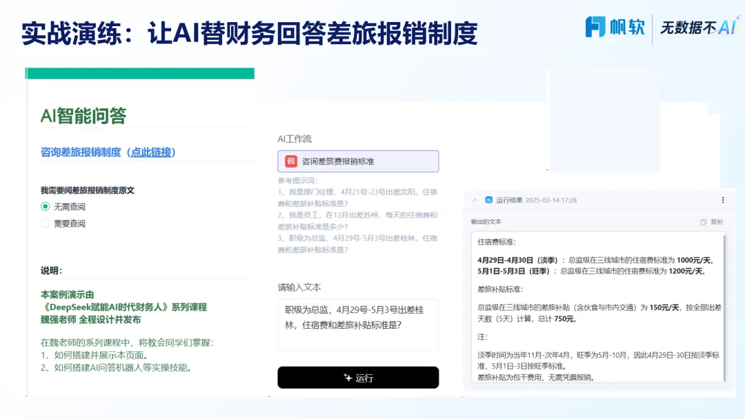 指南还提供了 5 项 AI 财务实战演练,涵盖差旅报销制度问答、财务分析 + PPT 生成、数据统计查询、专业问题头脑风暴、存货管理咨询等实操场景,助力财务人快速落地 AI 应用。未来,财务部门将升级为大数据及智能财务运营管理中心,财务人才培养也将转向 “会计理论 + AI 技能 + 业财融合” 的新模式,善用 AI 者将成为行业王者,而拒绝变革者可能面临被替代的风险。