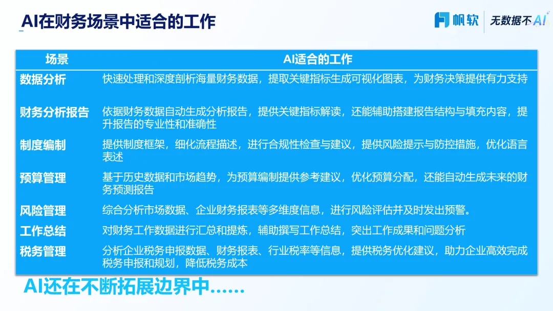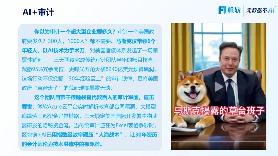 当前财务工作仍存在数据搬运繁琐、人力成本高、电子档案应用不充分等痛点,而 AI 技术的崛起正颠覆传统财务模式 —— 马斯克团队用 AI 三天完成传统审计团队半年的工作量,印证了 AI 在财务领域的高效能。AI 可广泛应用于数据分析、报告生成、制度编制、预算管理、风险管理等多个场景,通过自动化处理海量数据、提炼关键信息,大幅提升工作效率与精准度。