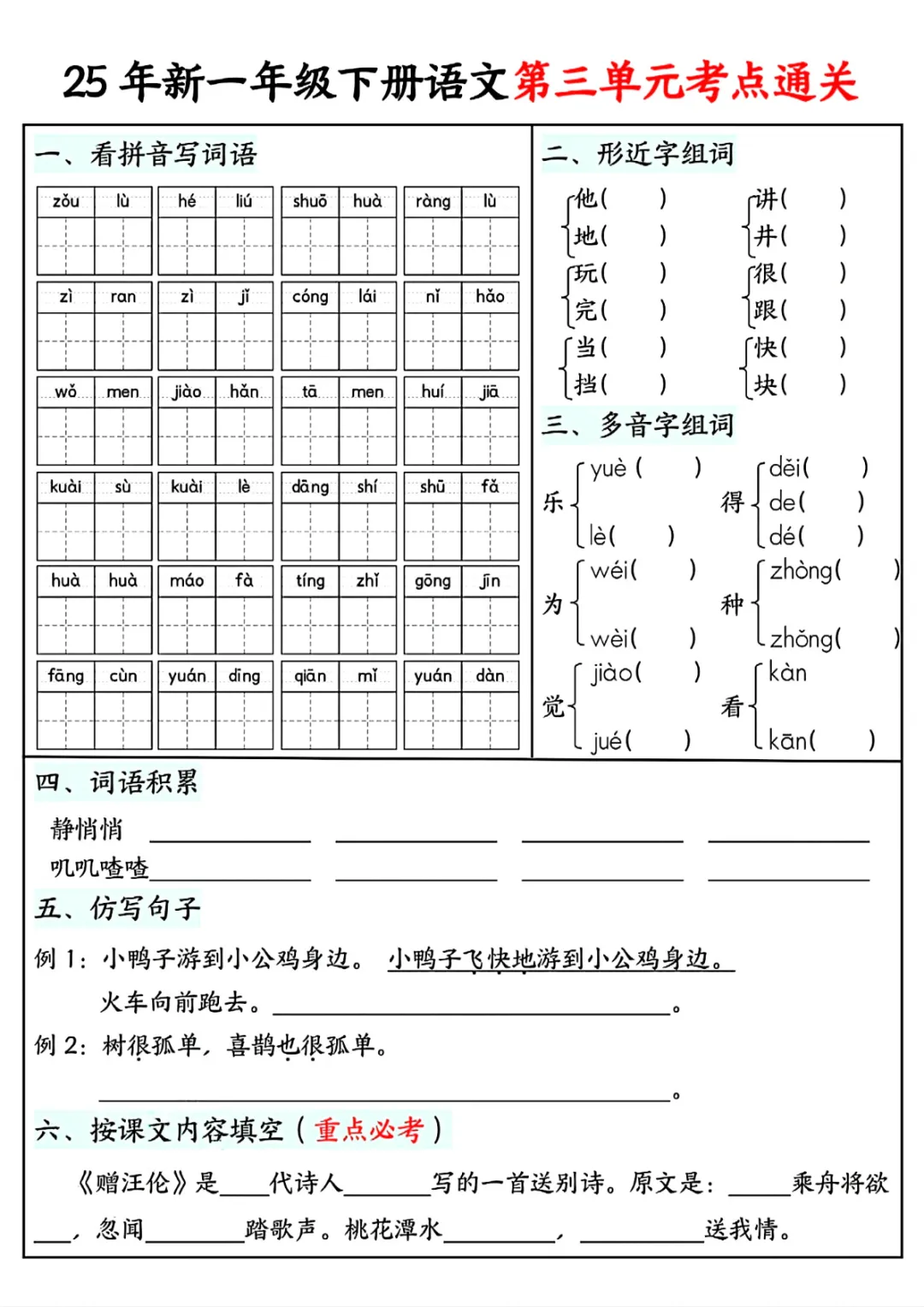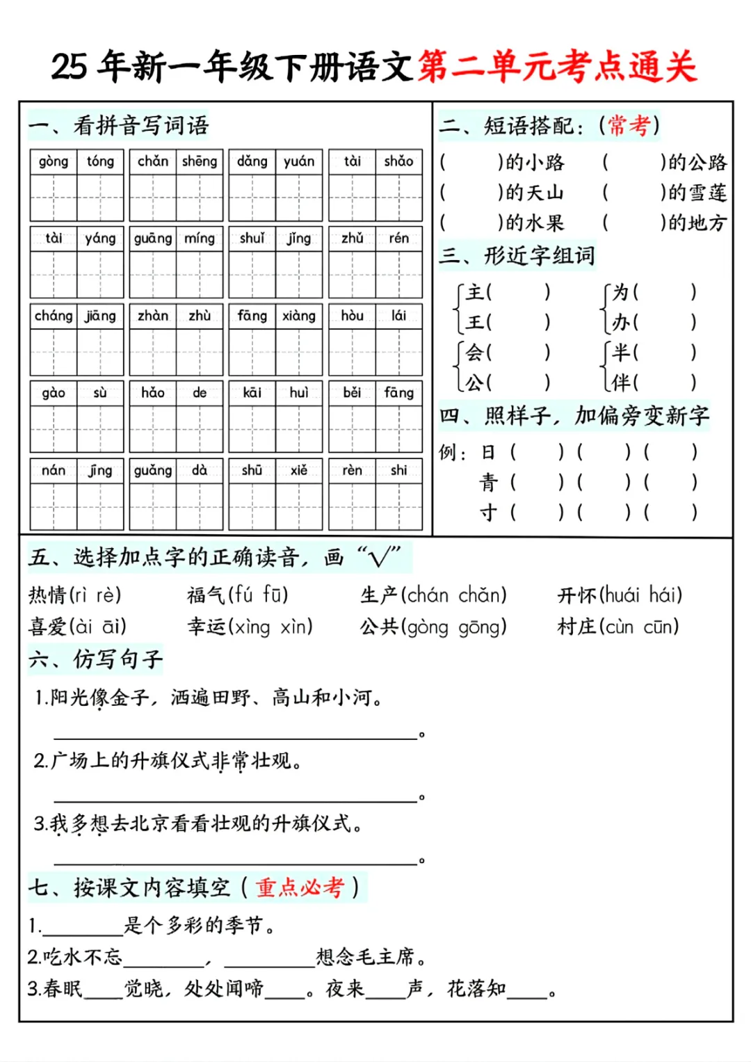 一年级(下)语文 单元考点通关练习
