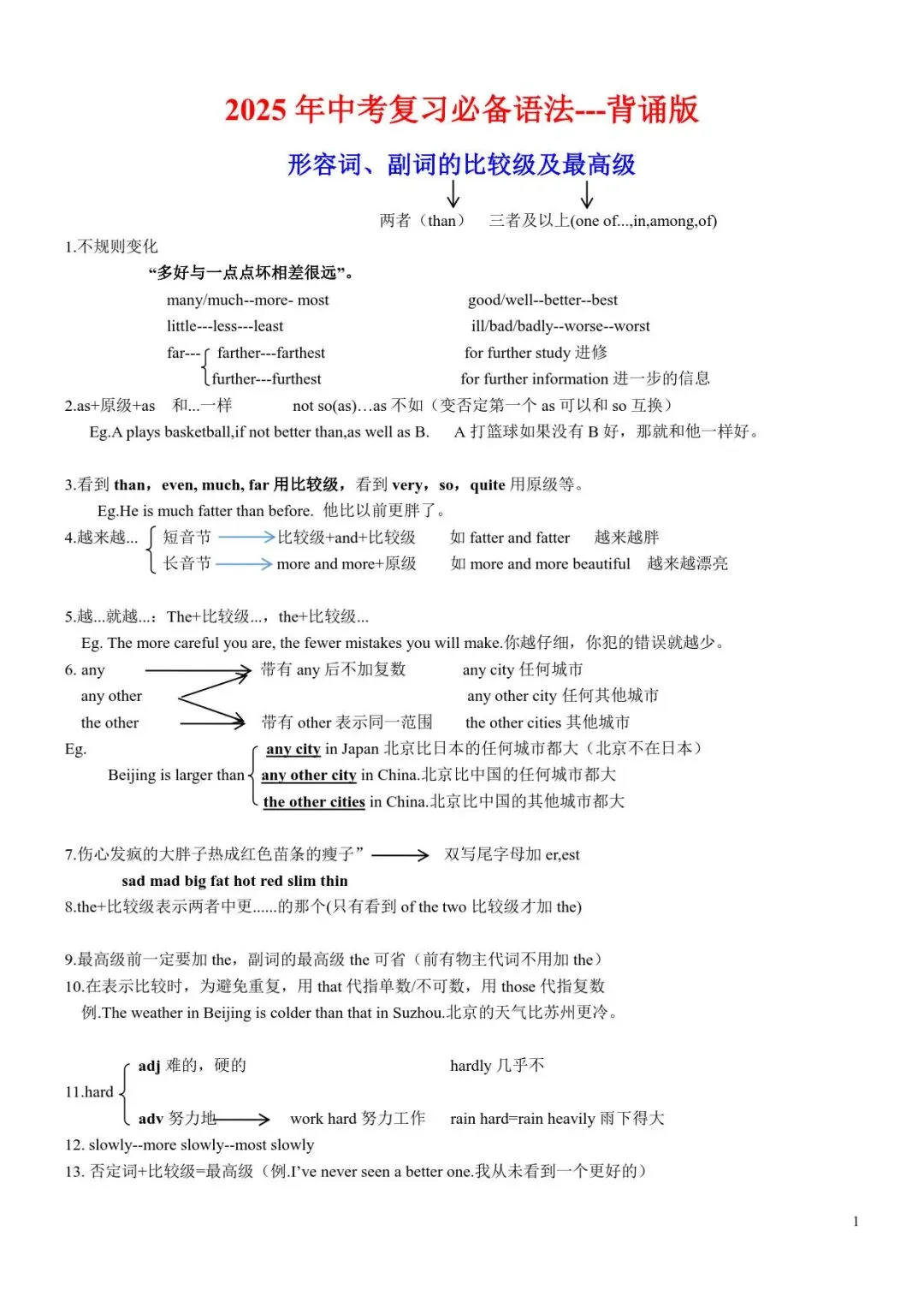 英语语法是考试中的关键环节。为帮助大家高效复习,今天特别分享一份中考英语必备语法精华资料,包含背诵版与默写版,系统梳理初中必考语法重点与难点,助力冲刺阶段查漏补缺、巩固提升!