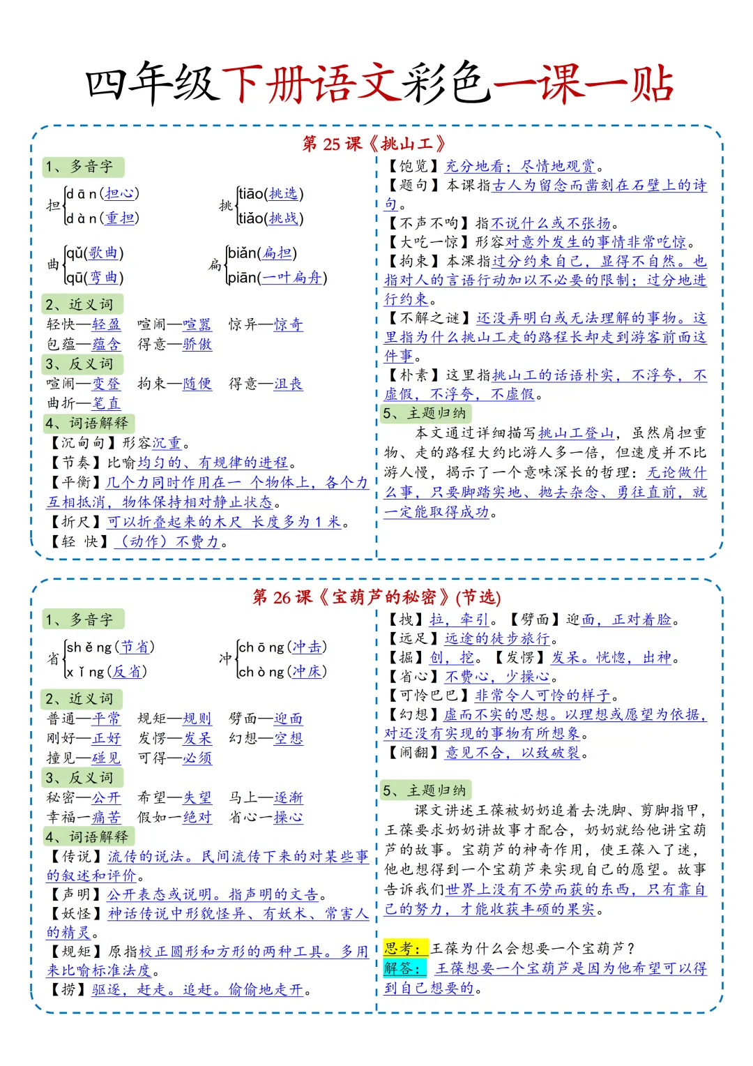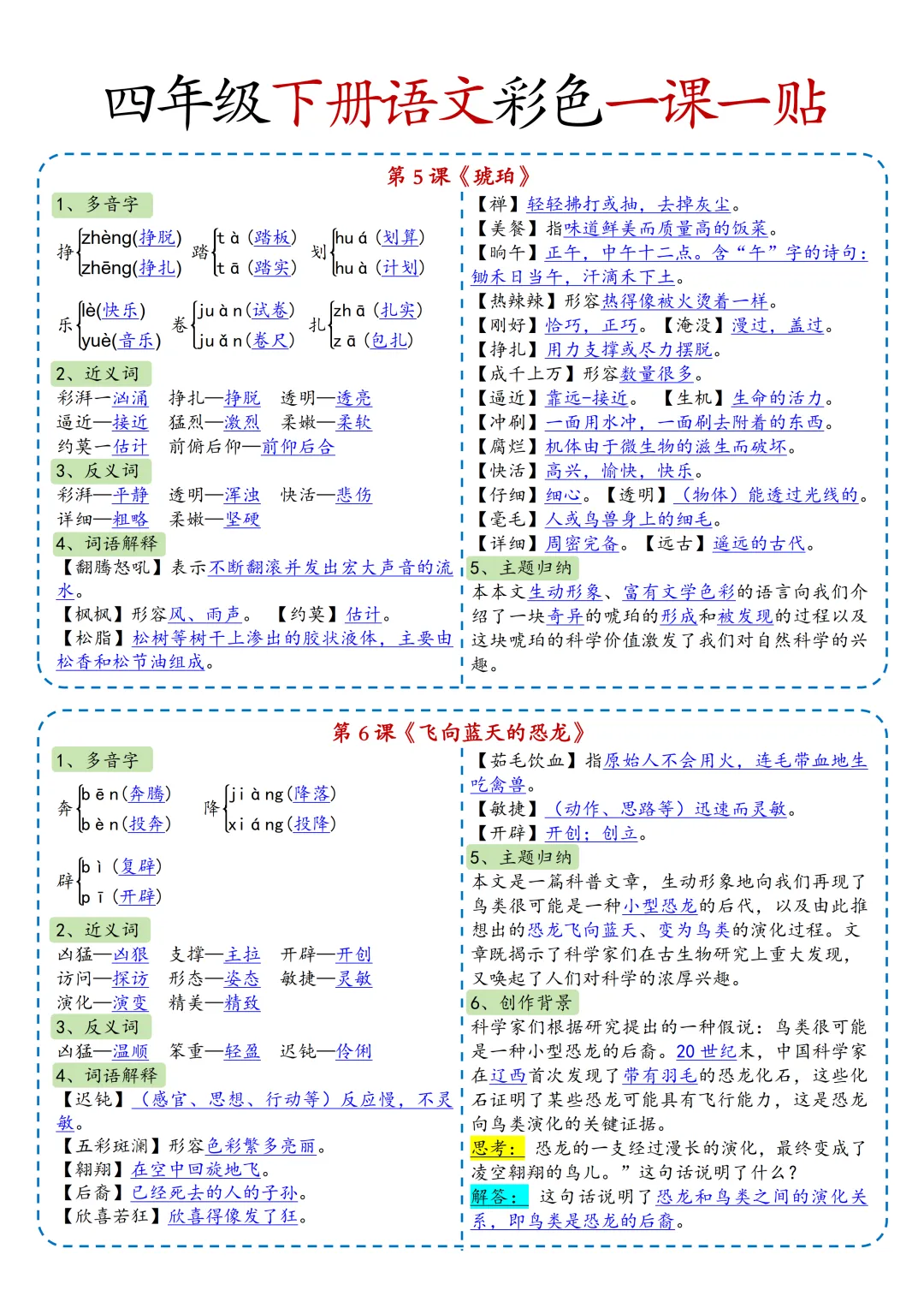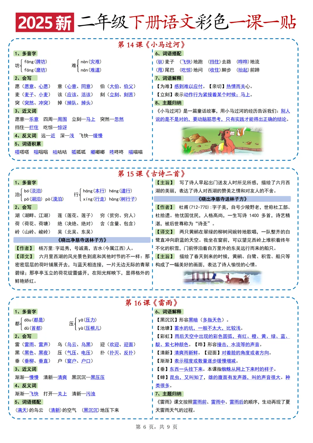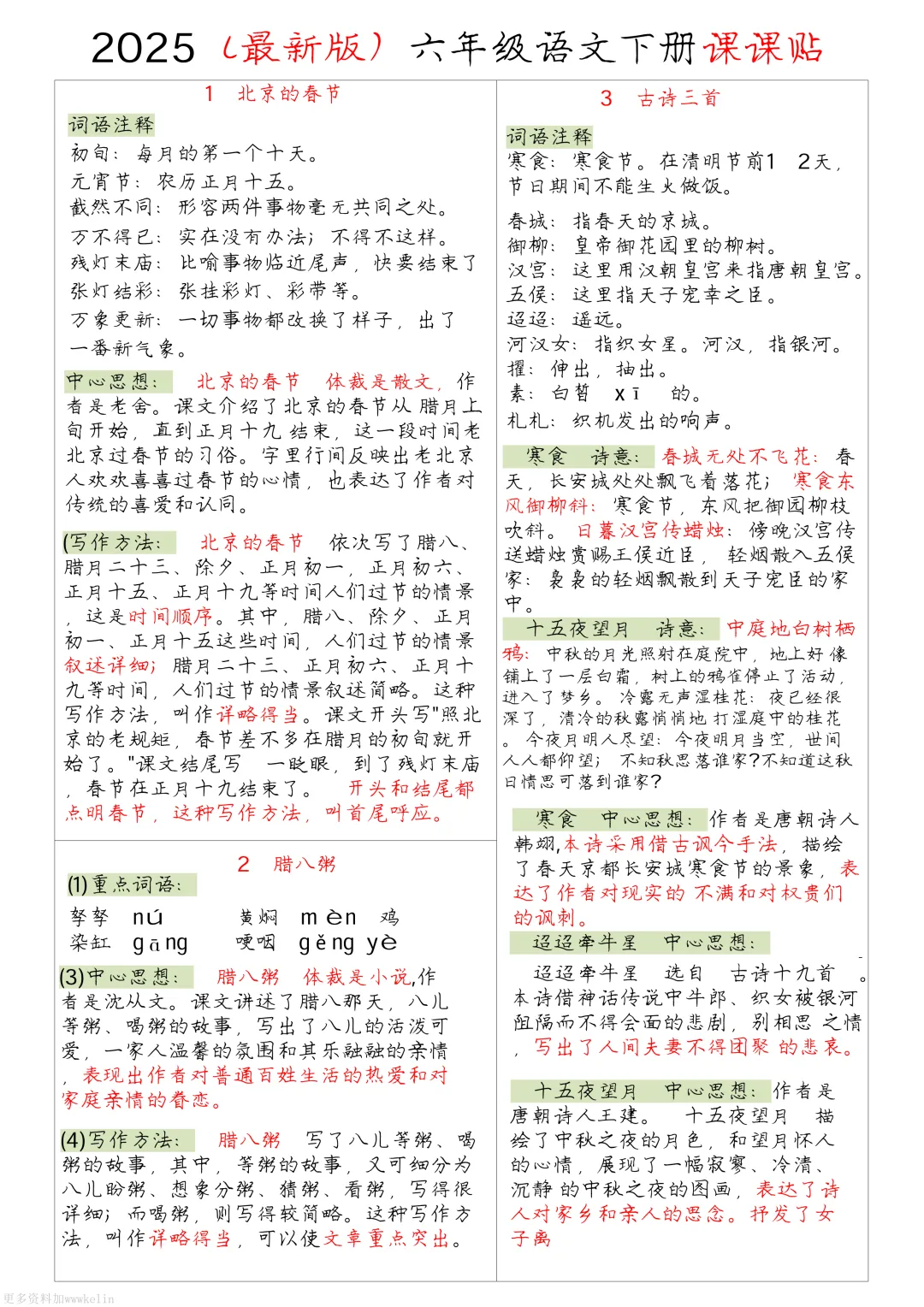 本期为大家带来的是小学语文1-6年级下册的一课一贴,是寒假预习的好帮手,包括每一课的重点字词,课文中心意思的归纳等等,PDF电子版在文章末尾下载。