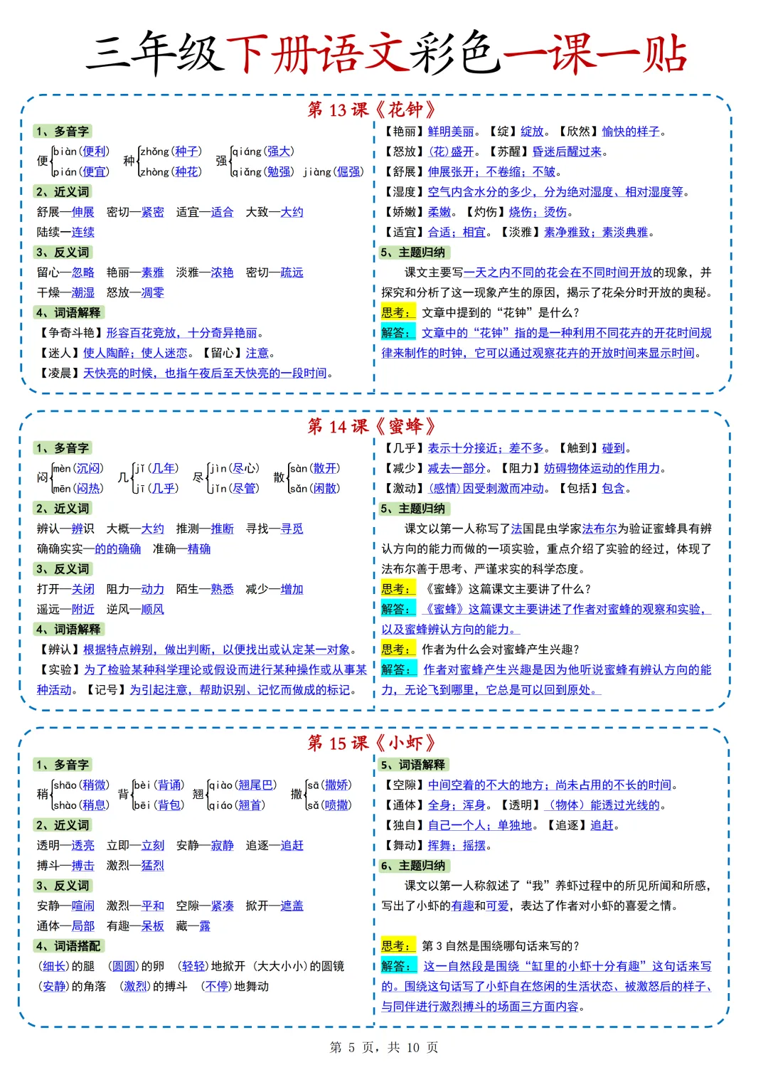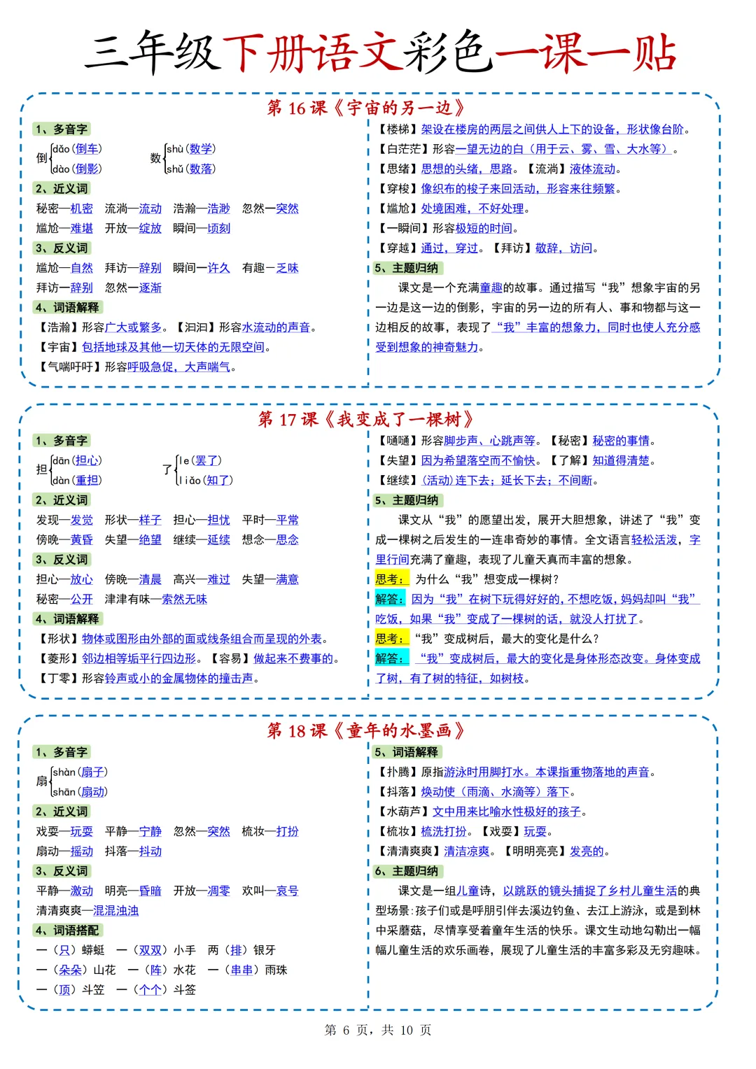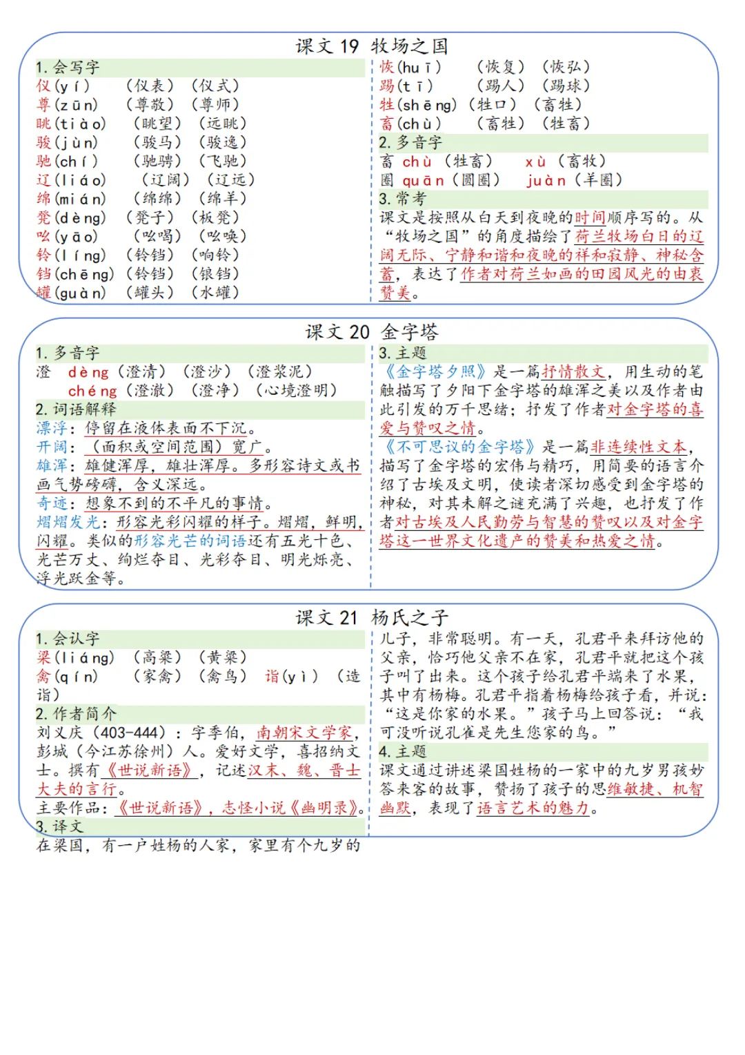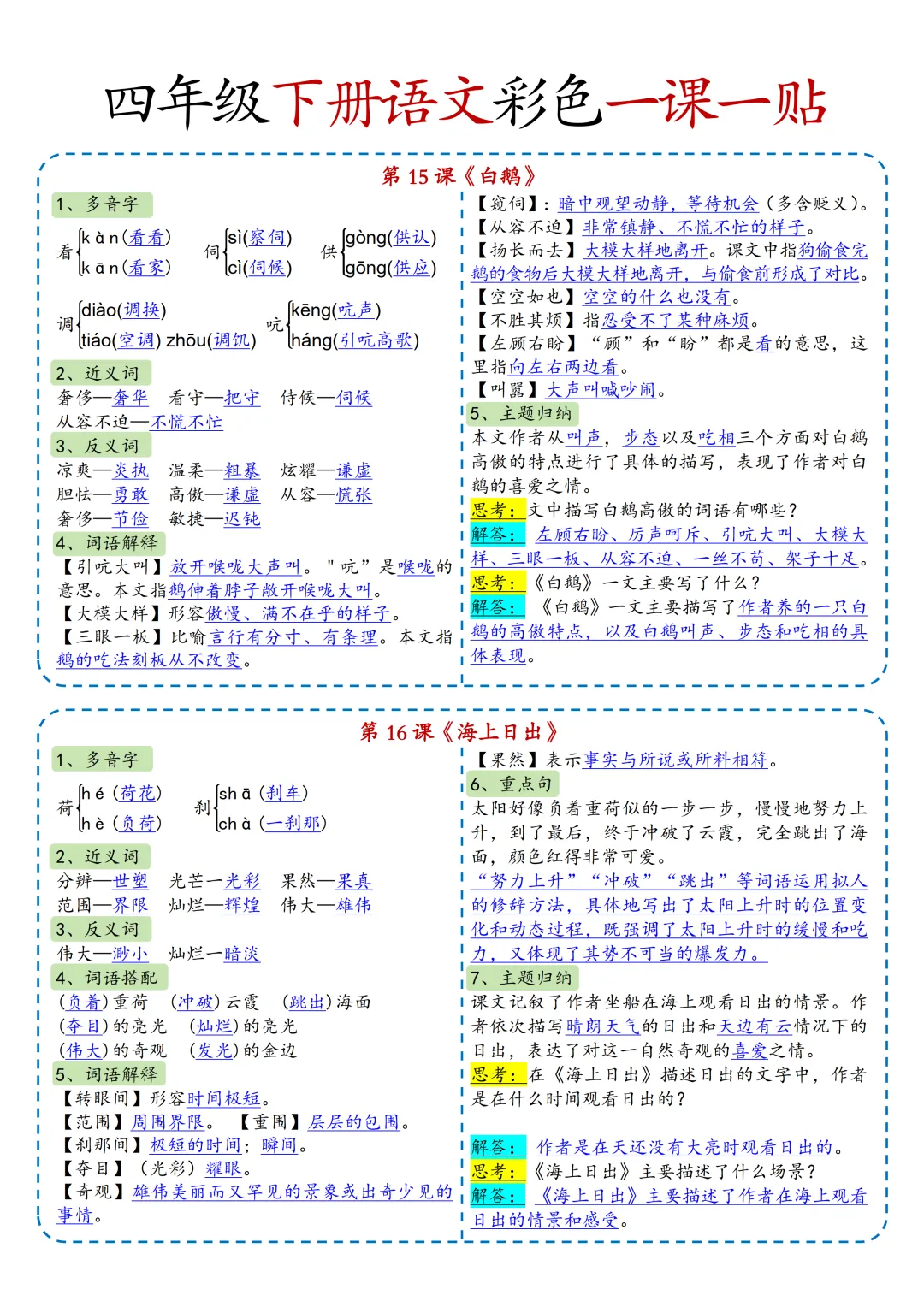 本期为大家带来的是小学语文1-6年级下册的一课一贴,是寒假预习的好帮手,包括每一课的重点字词,课文中心意思的归纳等等,PDF电子版在文章末尾下载。
