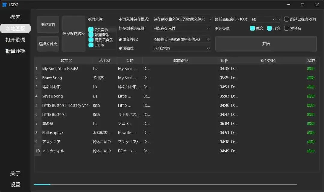 1. 多线程极速匹配LDDC采用先进的多线程技术,同时从多个音乐平台搜索歌词,速度比普通工具快上数倍。只需将歌曲文件拖入界面,几秒钟内就能找到最匹配的歌词,省去手动搜索的麻烦。