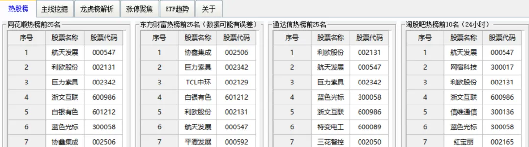 分别展示同花顺热榜前25名、东方财富热榜前25名、通达信热榜前25名、淘股吧热榜前10名。