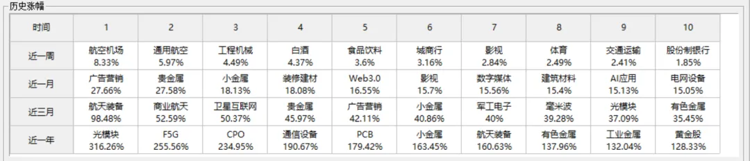 历史涨幅的统计,分别统计和排序近一周、近一月、近三月、近一年相关板块的涨幅榜。