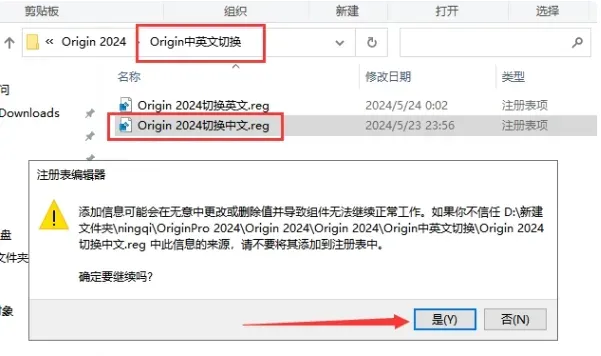 18. 打开Origin中英文切换文件夹,双击运行【Origin 2024 切换中文.reg】,弹出对话框,点击【是】。