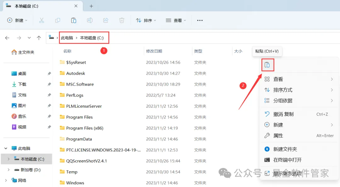 17、打开本地C盘,再右键文件夹的空白处,点击【粘贴按钮】