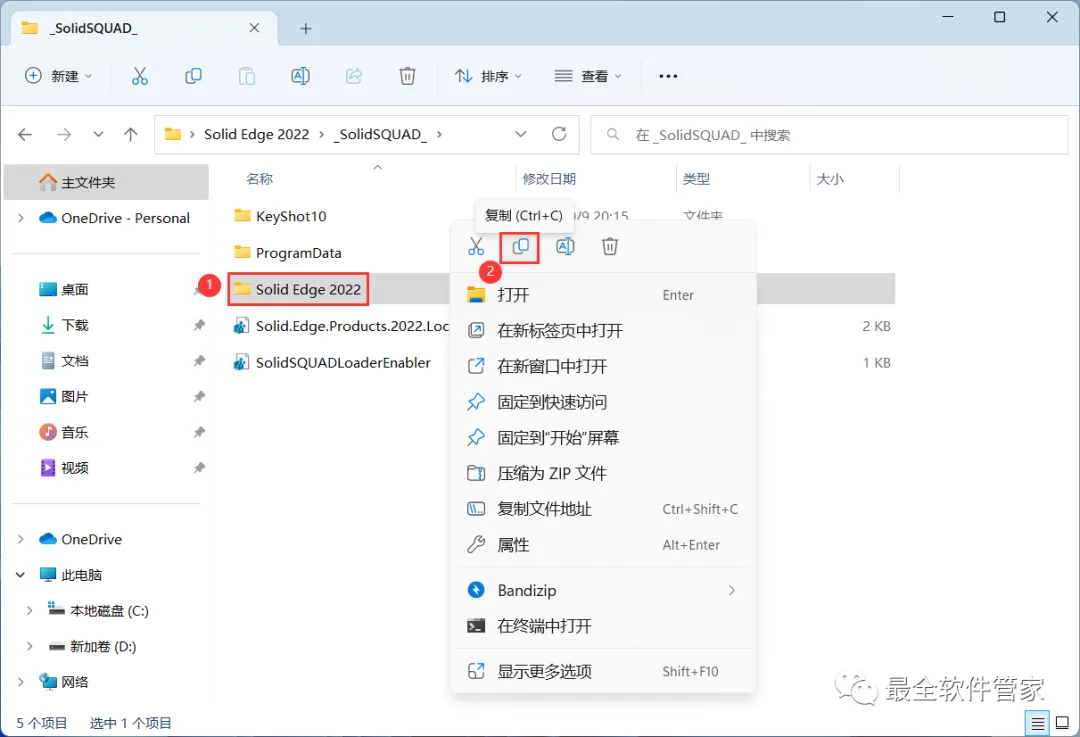 13、回到Solid Edge 2022文件夹的_SolidSQUAD_】文件夹,找到【Solid Edge 2022】文件夹,再右键点击【复制按钮】