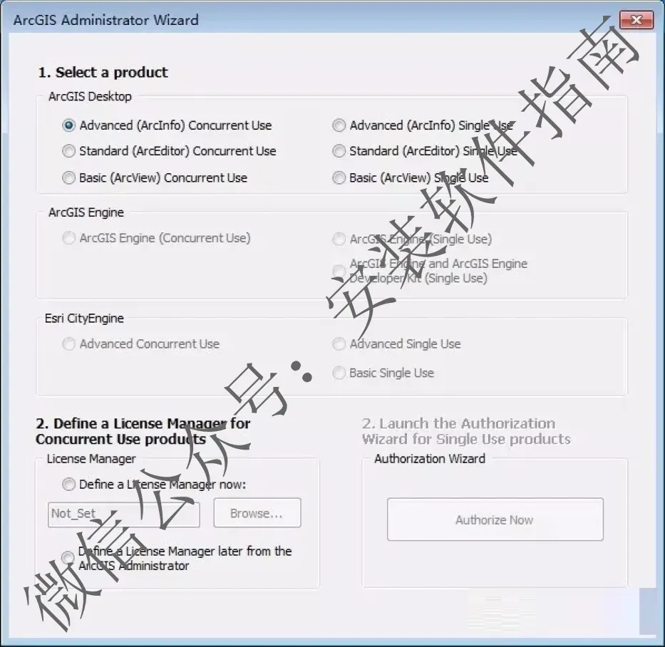 44.回到40步的那个框里,选择Advanced( ArcInfo)Concurrent Use,然后点Define a license Manager now,将刚才复制的计算机全名粘贴到下面的框里,然后点OK