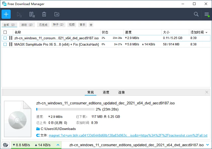 速度也能打。它会把文件切成好几段同时下,相当于好几根管子一起灌水,比单线程快不少。我测过同一个 HTTP 链接,浏览器下是 2MB/s,FDM 能跑到 5MB/s,尤其下国外资源时,加速效果更明显。