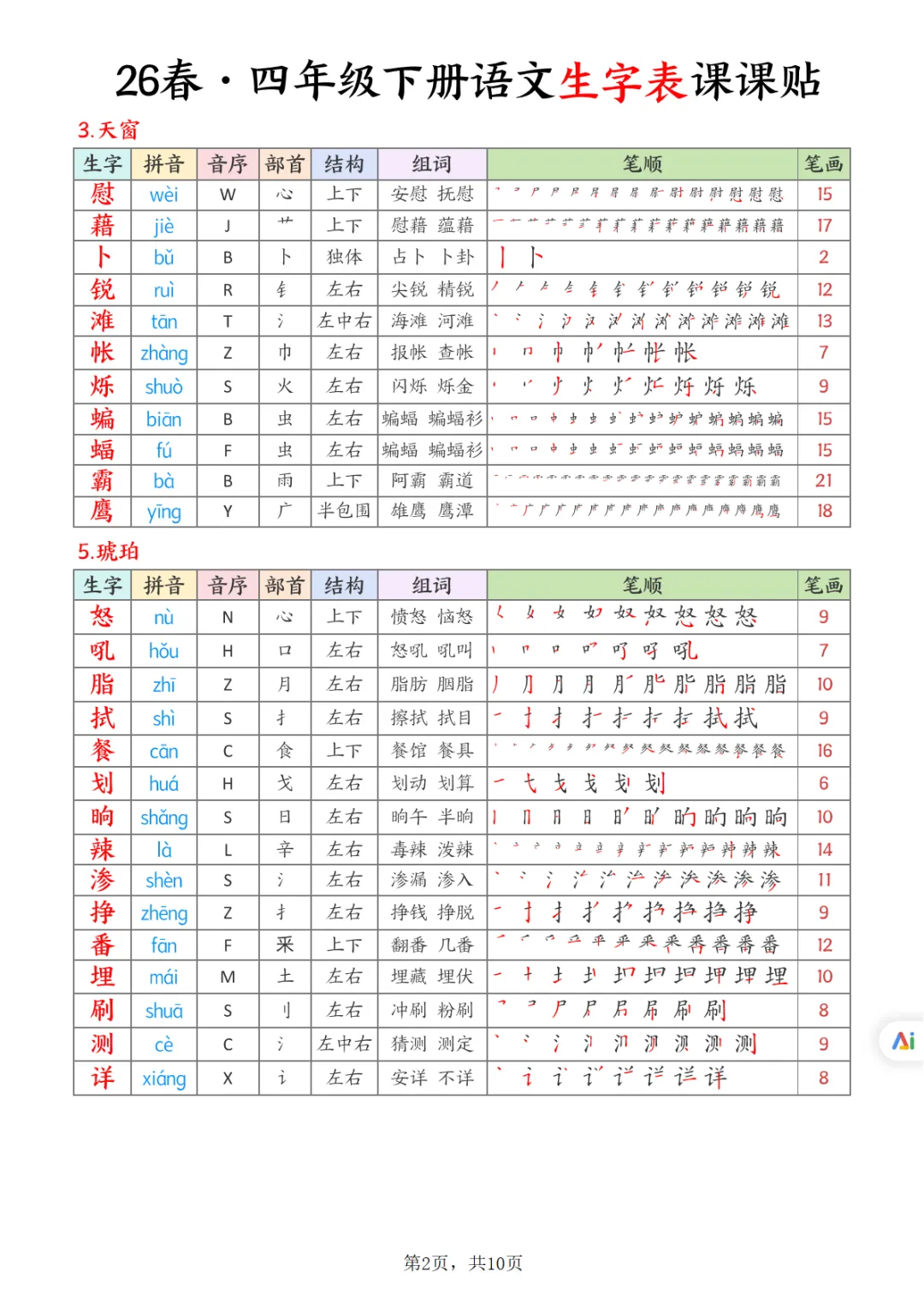 >【免费下载】26春四下语文生字表课课贴10页,PDF电子版,可打印