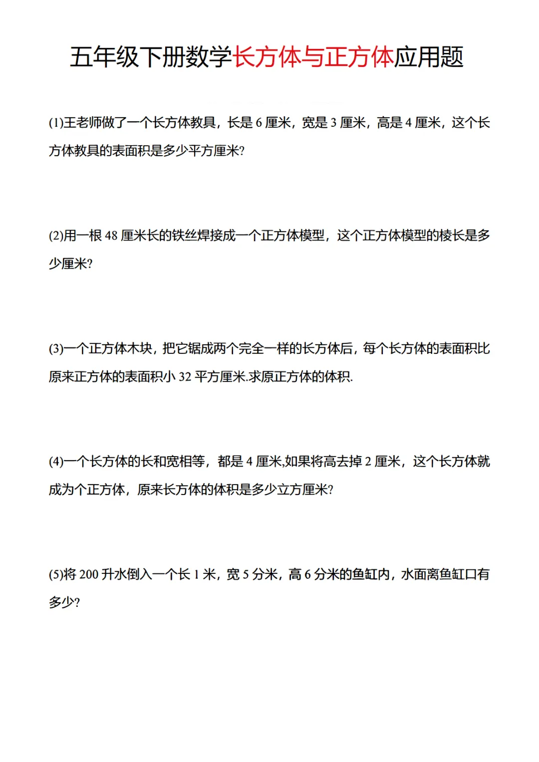 【免费下载】五年级(下)数学 长方体与正方体应用题,PDF电子版,可打印