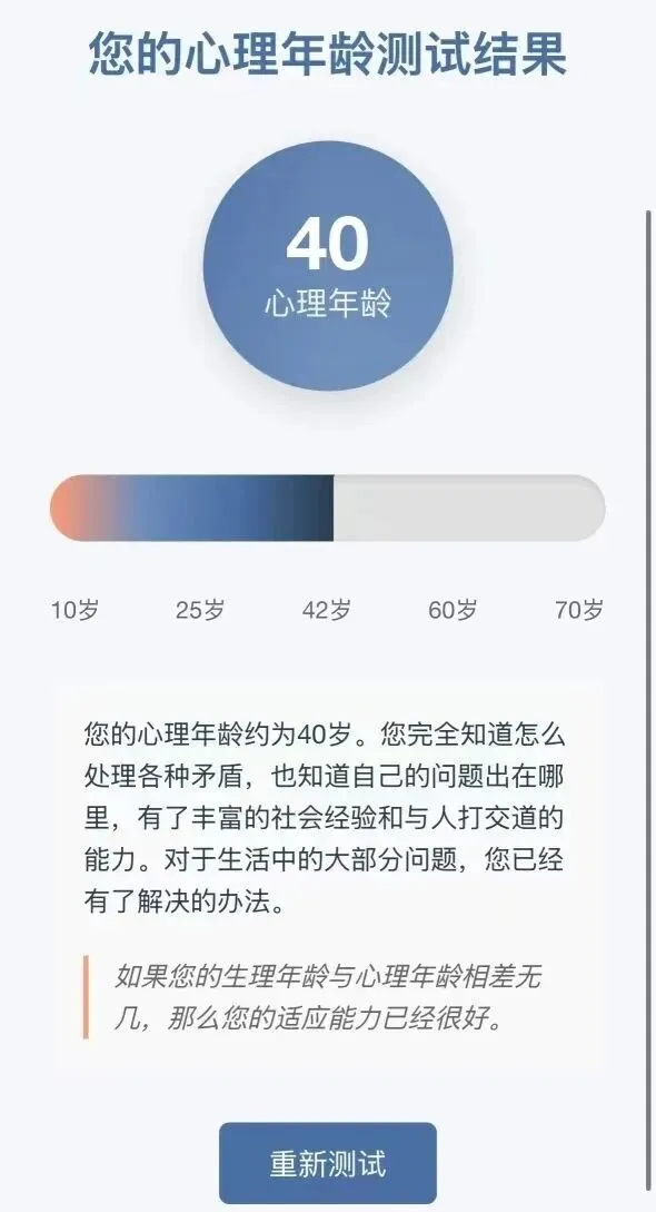 心理年龄是指依照心理活动的健全程度,从而确定的个体年龄。有的人年纪轻轻却少年老成,遇事镇定自若,有的人岁数大了仍然童心未泯,精神饱满。因此我们总是把心理年龄与生理年龄区分开来。你好奇你的心理年龄多少岁吗?想知道与你的生理年龄相符还是差别很大呢?不妨做以下测试看看!