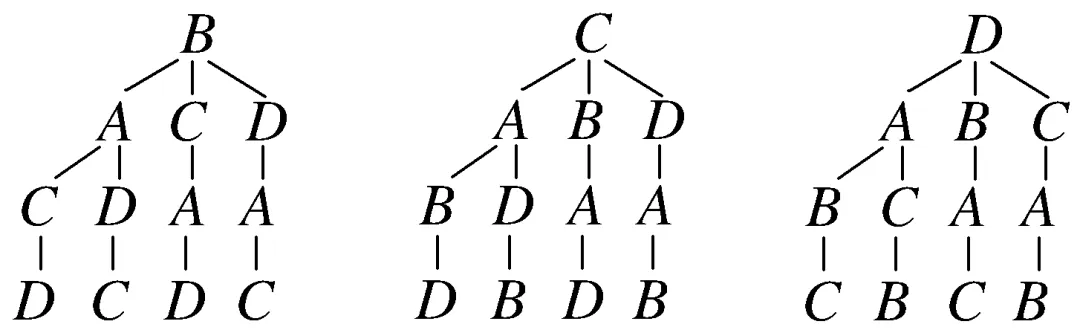 故所有可能的站法是BACD,BADC,BCAD,BDAC,CABD,CADB,CBAD,CDAB,DABC,DACB,DBAC,DCAB.