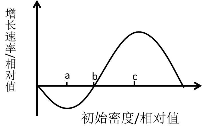 B、初始密度介于a~c时,应分两段来分析。在种群数量小于b时,其死亡率大于出生率,当种群数量大于b时,其出生率大于死亡率,表现为种群数量上升,B错误;