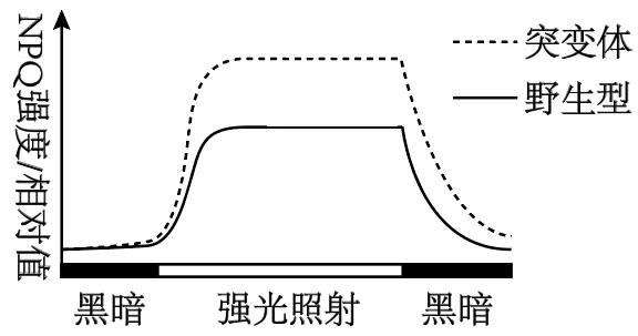 据图分析,强光照射下突变体中NPQ/相对值,而NPQ能将过剩的光能耗散,从而使流向光合作用的能量减少;突变体的NPQ强度大,能够减少强光对PSII的损伤且减少作用大于野生型H蛋白的修复作用,这样导致突变体的PSⅡ活性高,能为暗反应提供较多的NADPH和ATP促进暗反应进行,因此突变体的暗反应强度高于野生型。