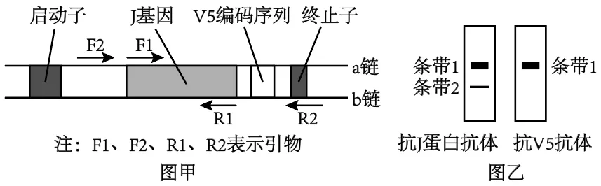 据图乙可知,用抗J蛋白抗体和抗V5抗体分别检测,均出现条带1,说明条带1是J-V5融合蛋白。抗J蛋白抗体检测出现条带2,抗V5抗体检测不出现条带2,说明条带2所检出的蛋白不是由重组质粒上的J基因表达的。