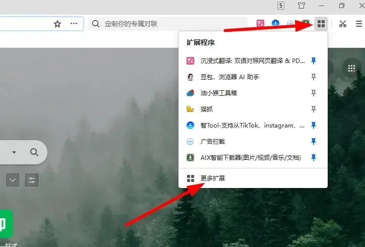 我们可以打开360浏览器,右上角有个四角,点击它。再点更多扩展,再点我的扩展。