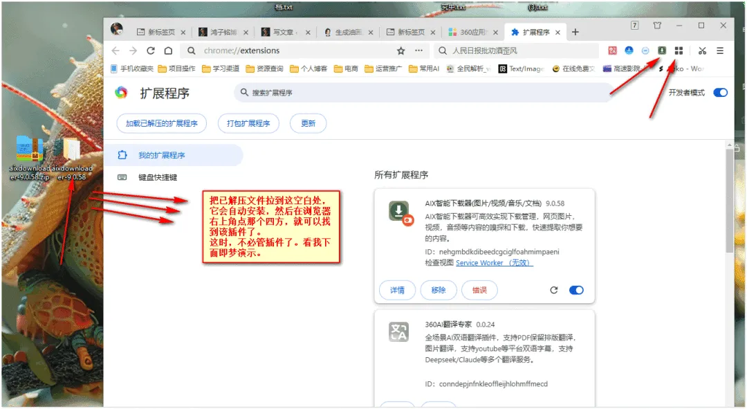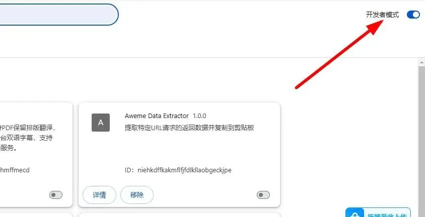 解压出来的文件夹,我们直接把它拉到开发者模式这个页面,只要鼠标按住文件夹拉到空白地方的话,它会直接安装。
