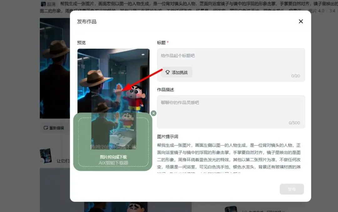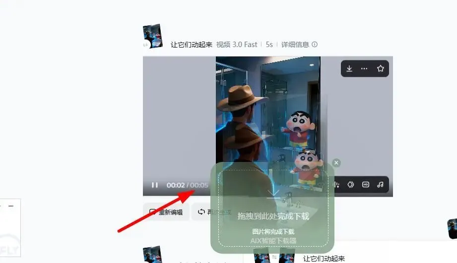 我们在即梦生成图片,视频的情况下,直接按住图片把它拉下来一点点,出现绿色的框框放进去,它会自动下载到桌面上。