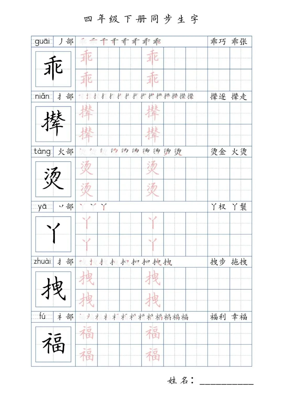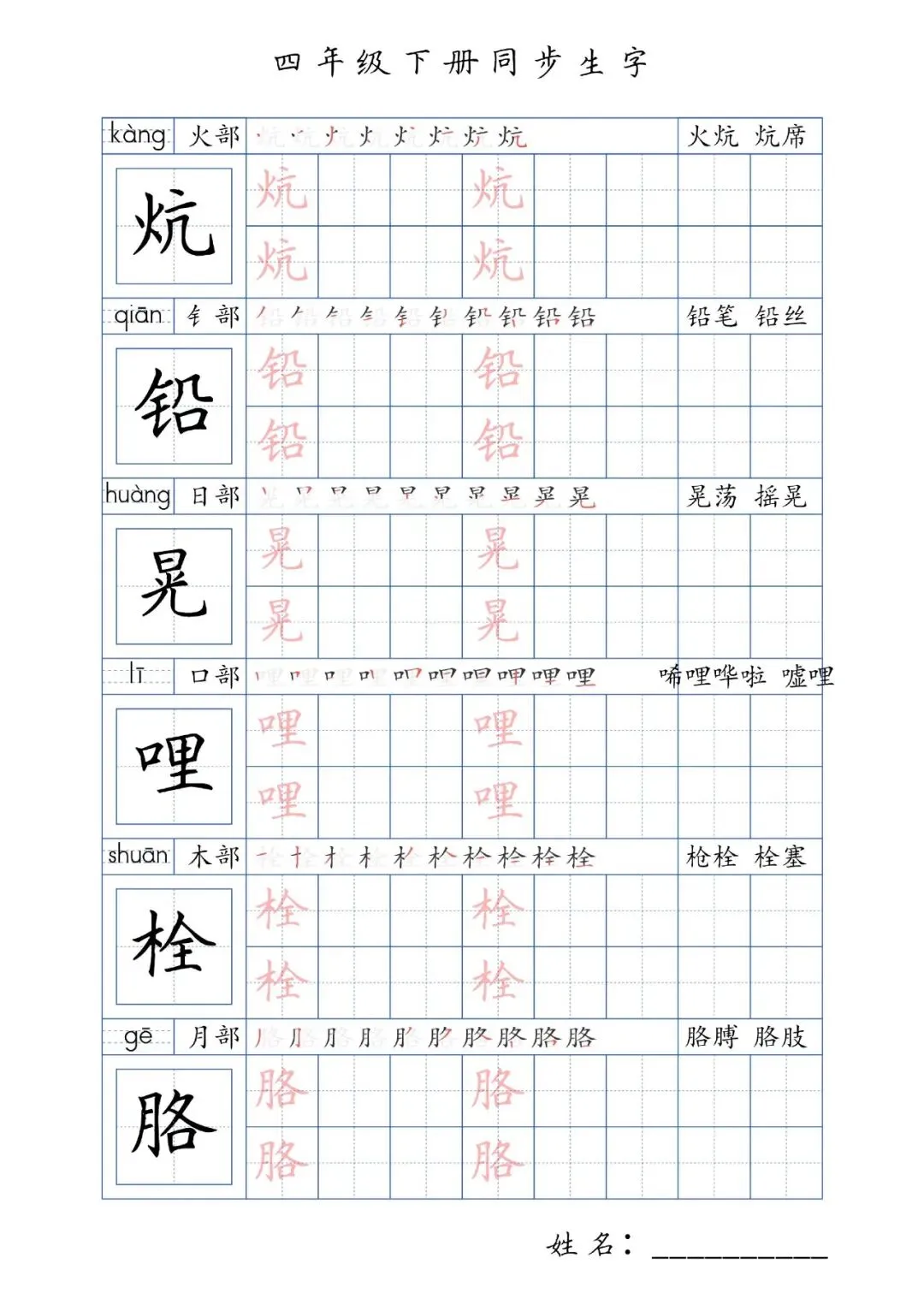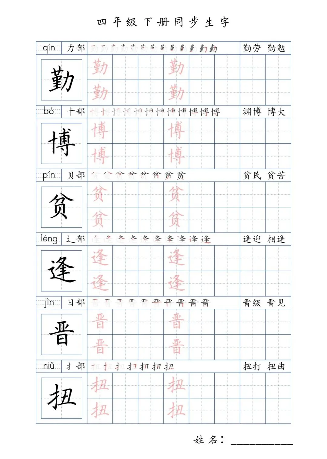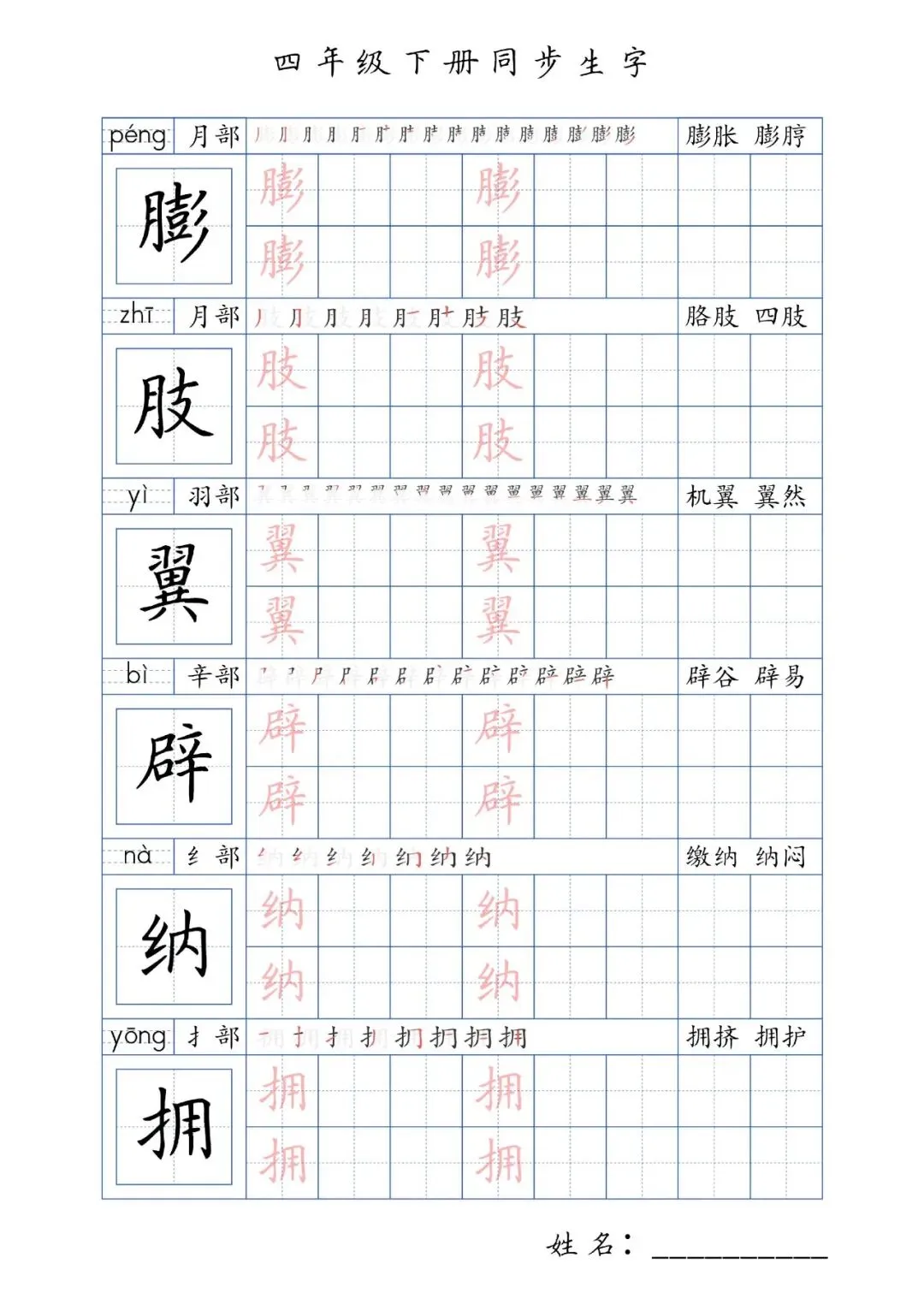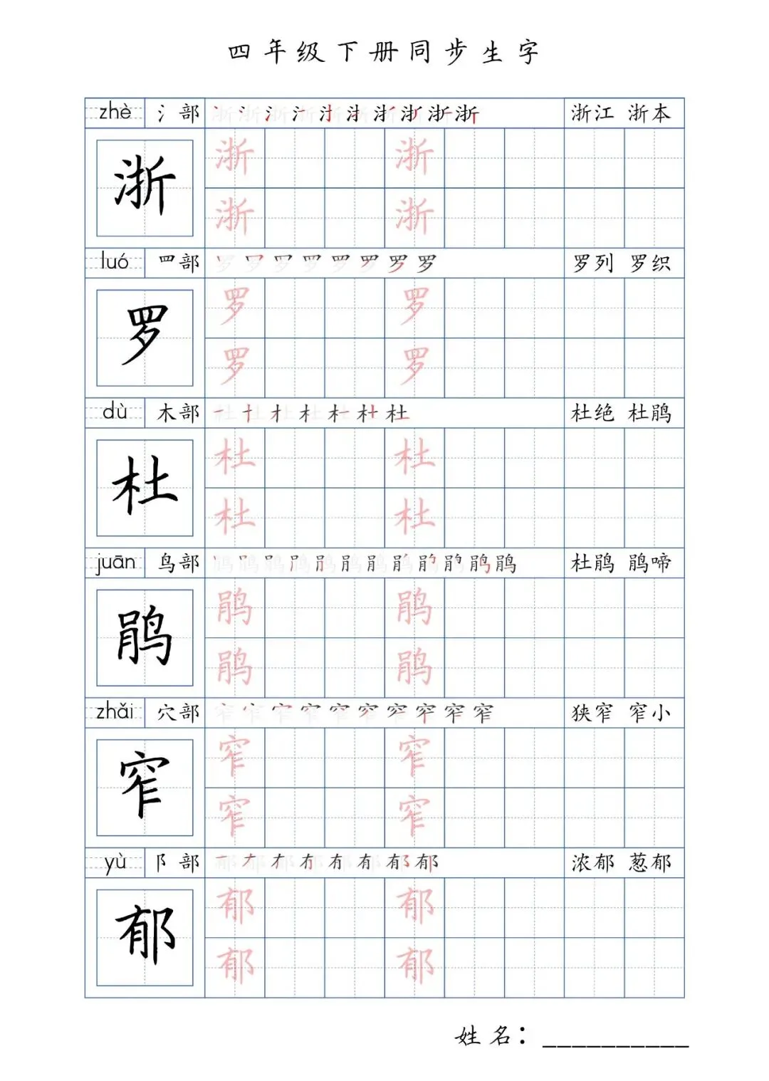 同步生字四年级下册,PDF免费下载