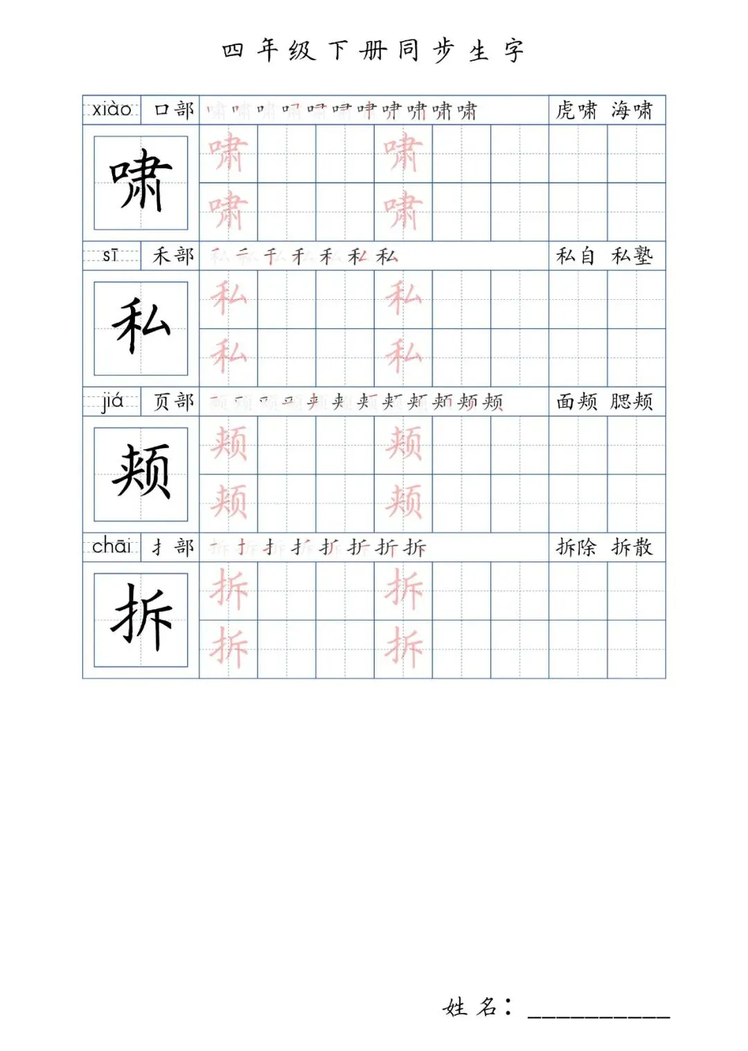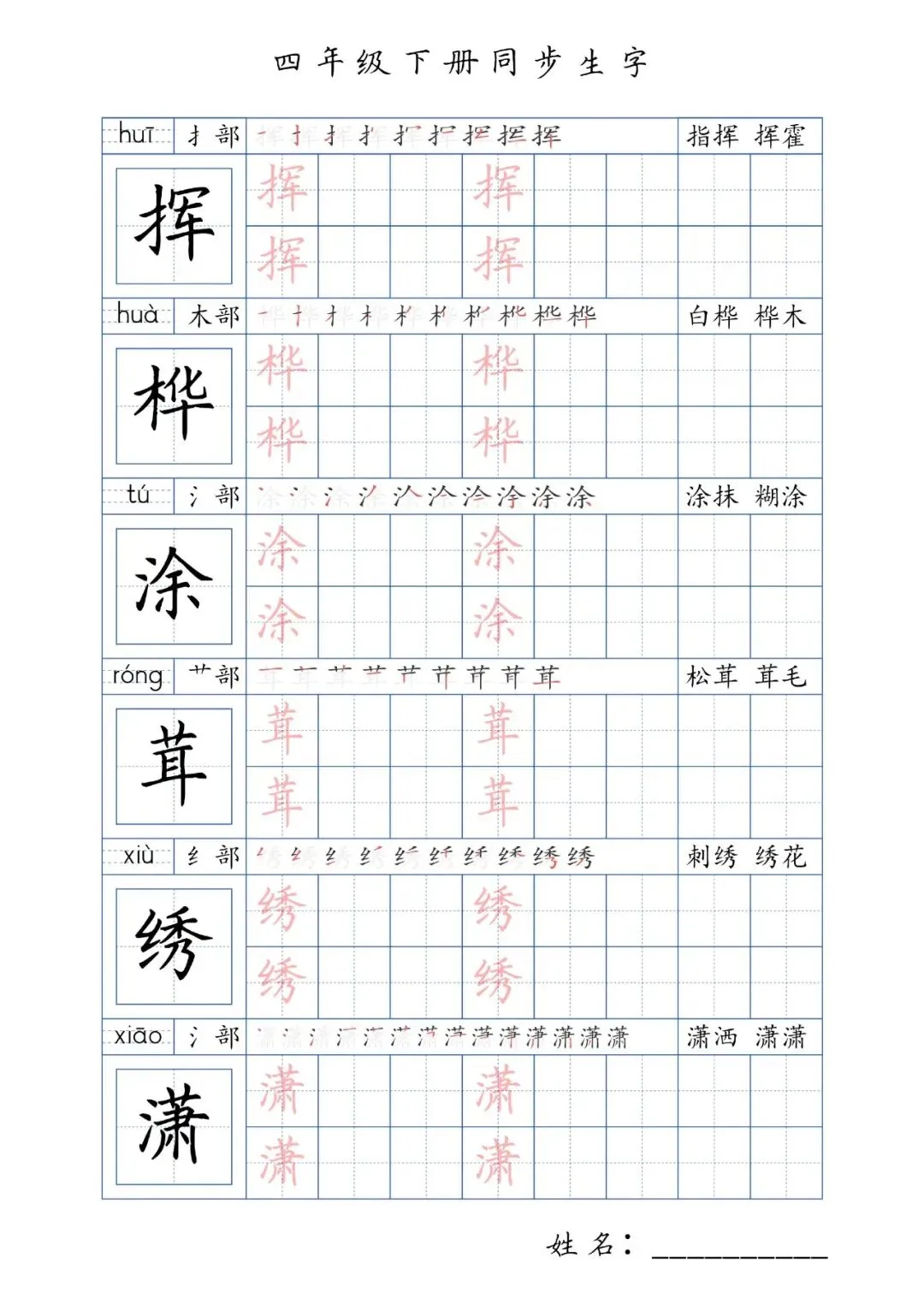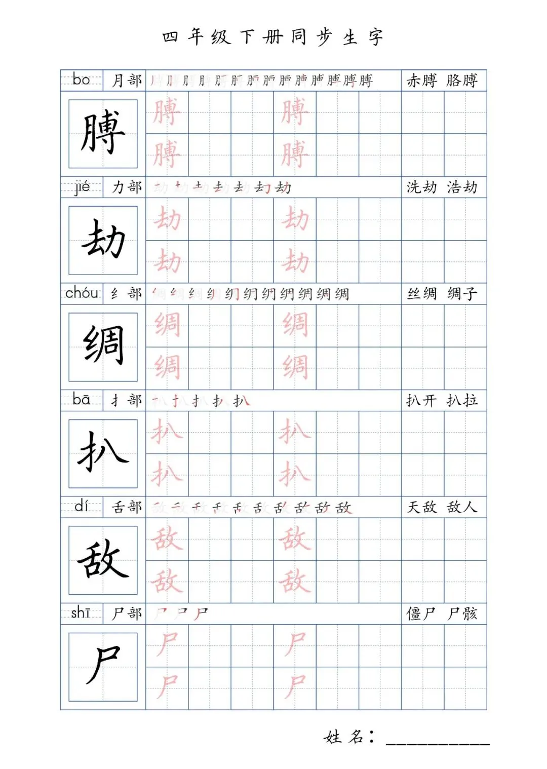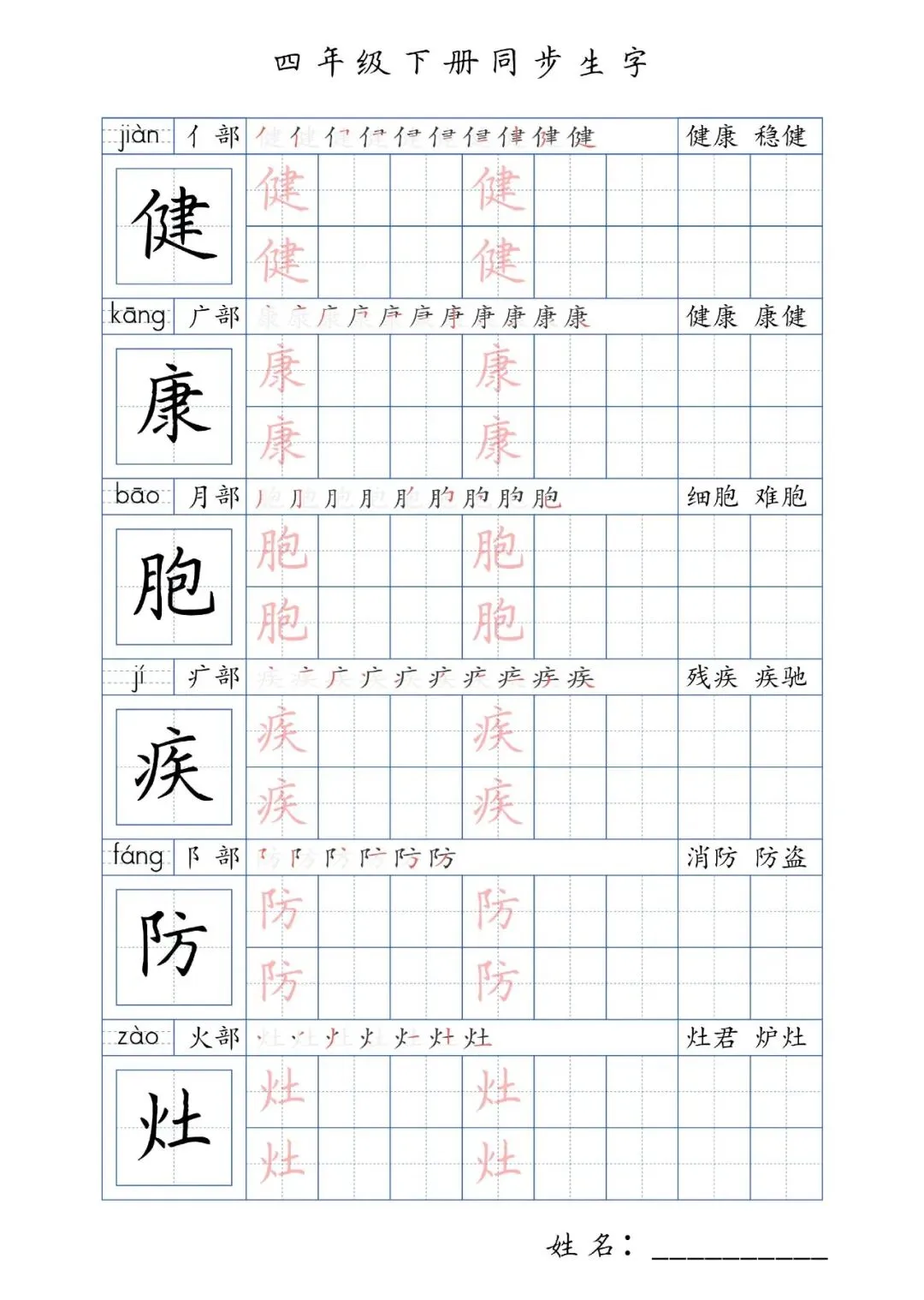 同步生字四年级下册,PDF免费下载