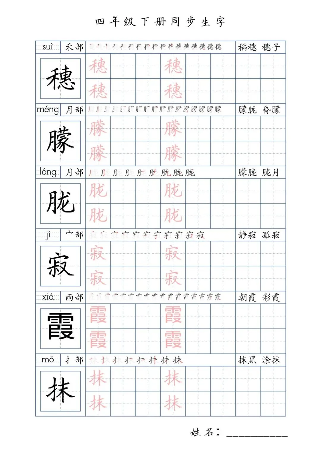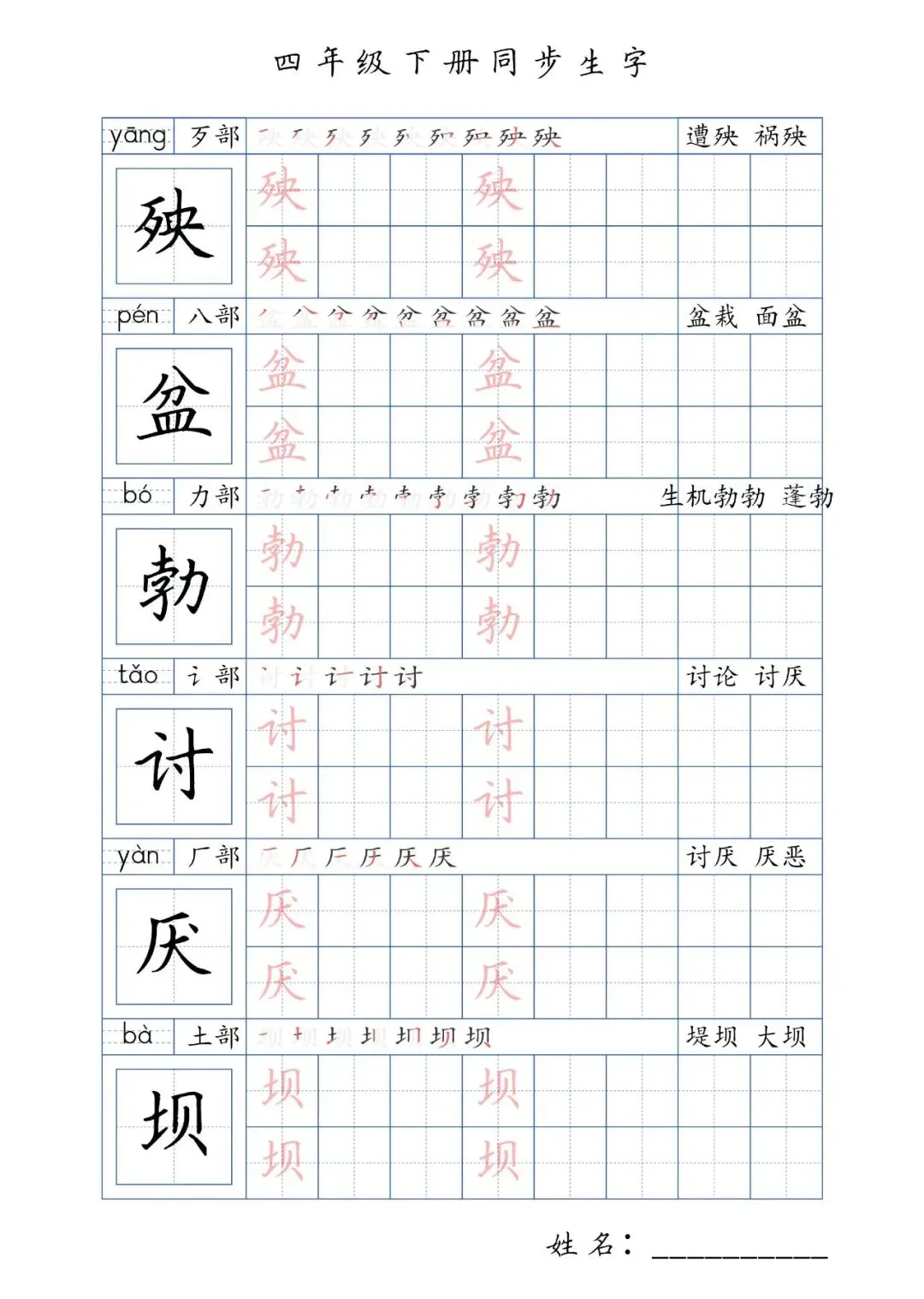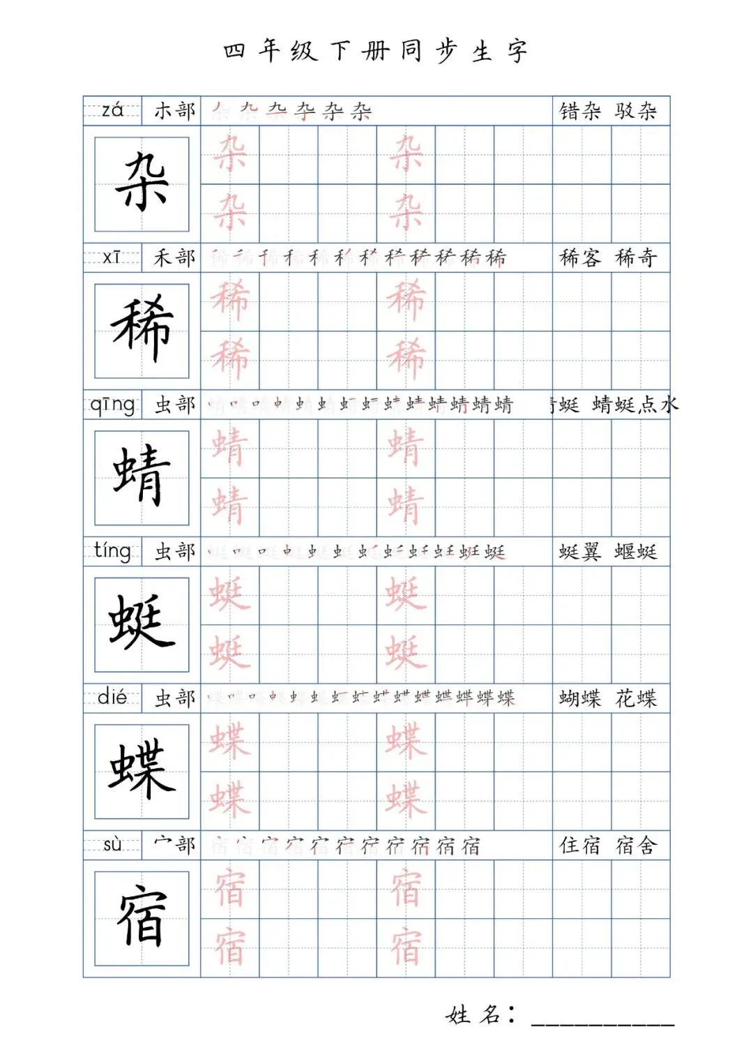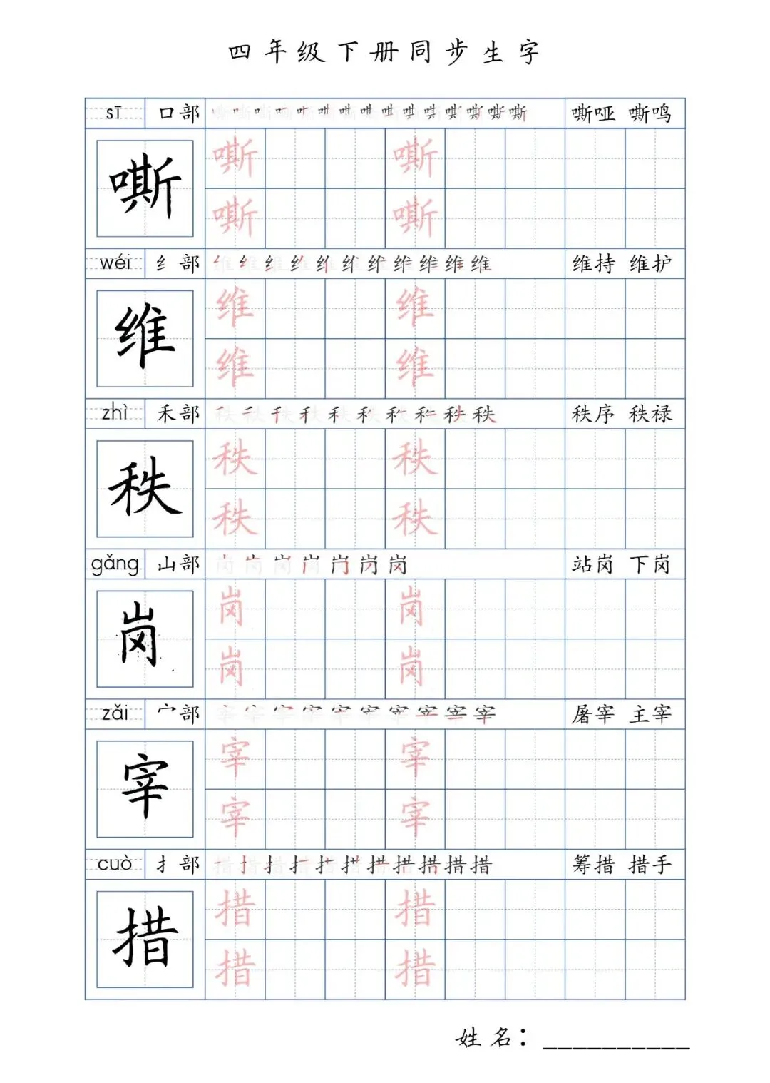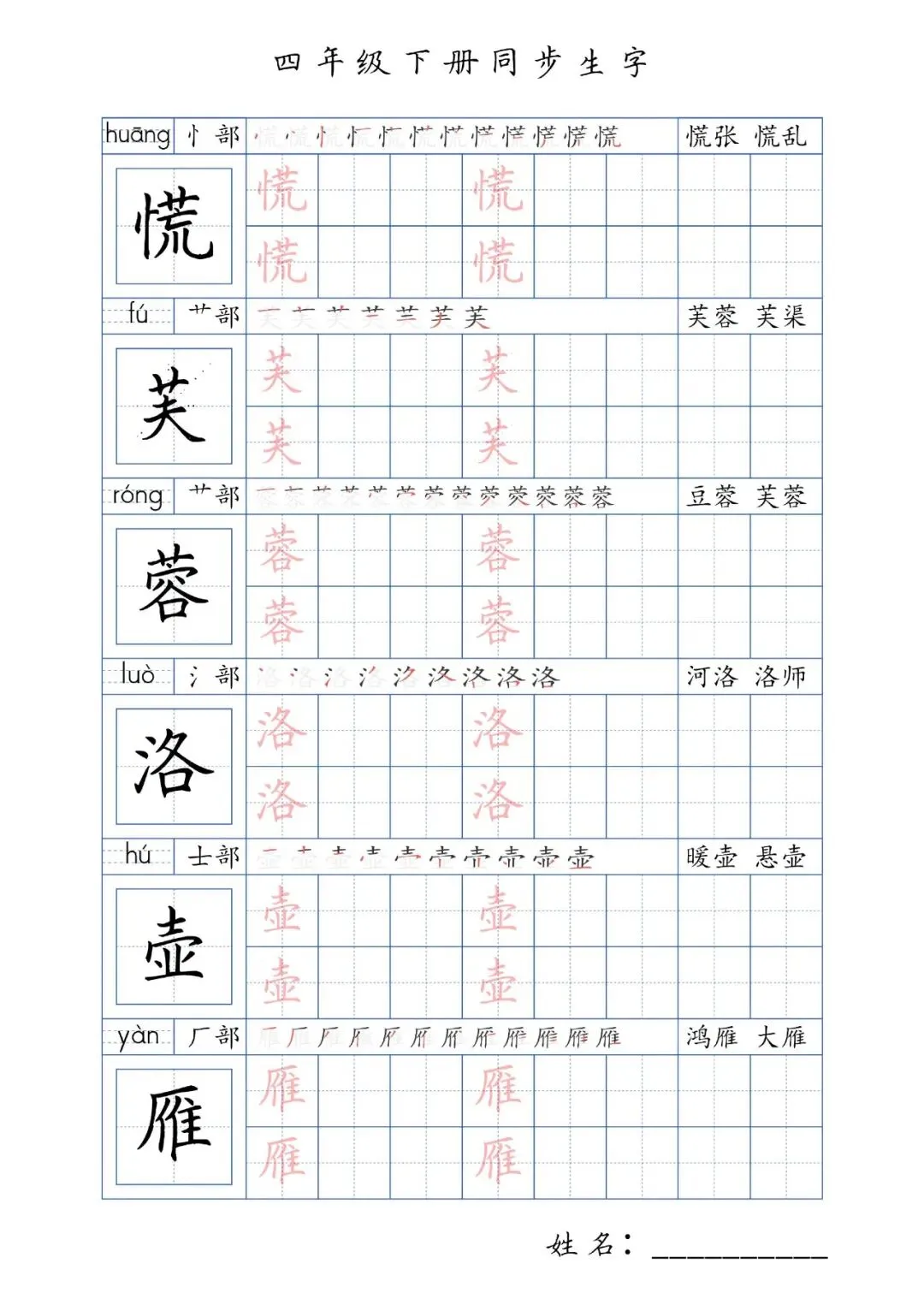 同步生字四年级下册,PDF免费下载