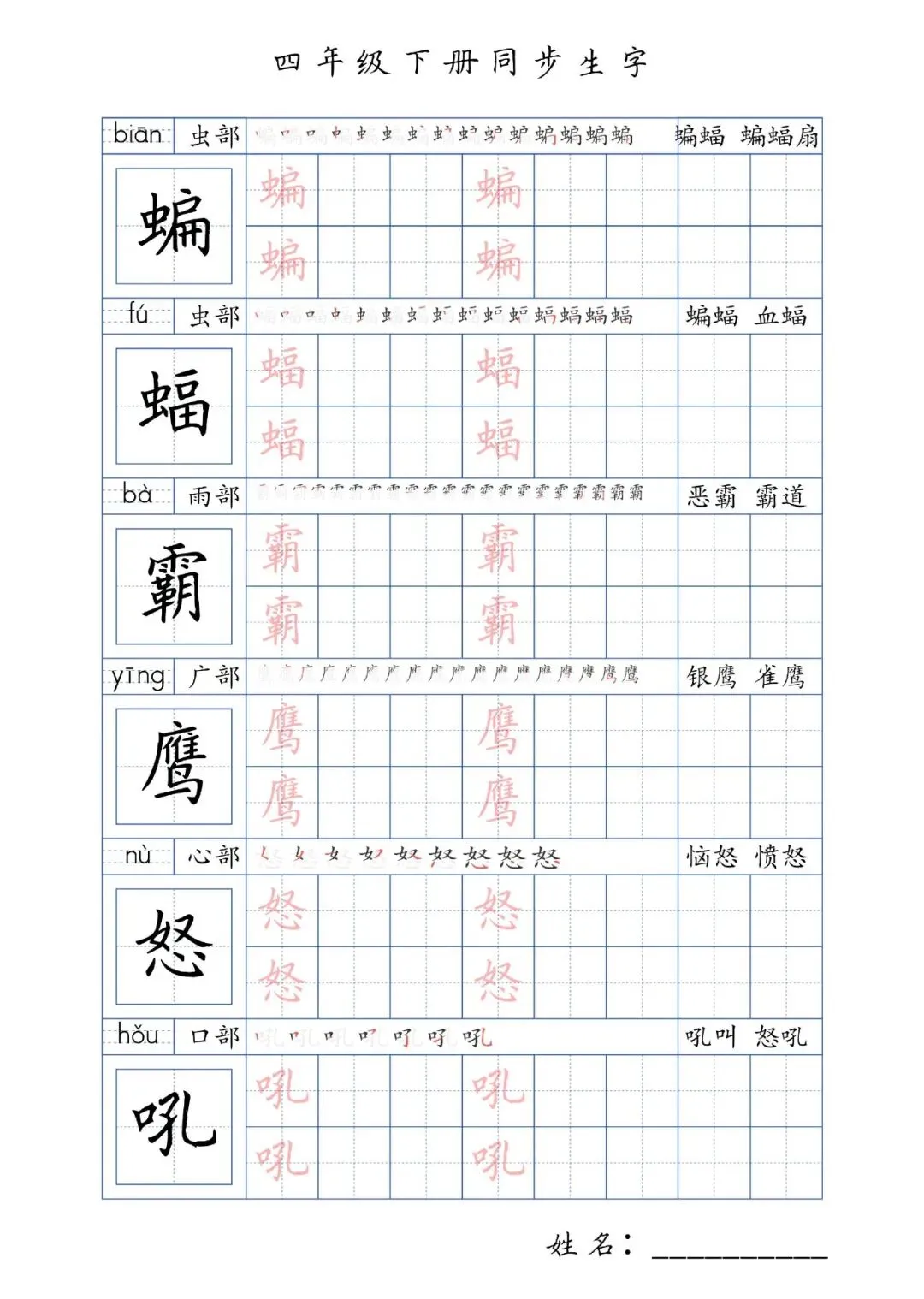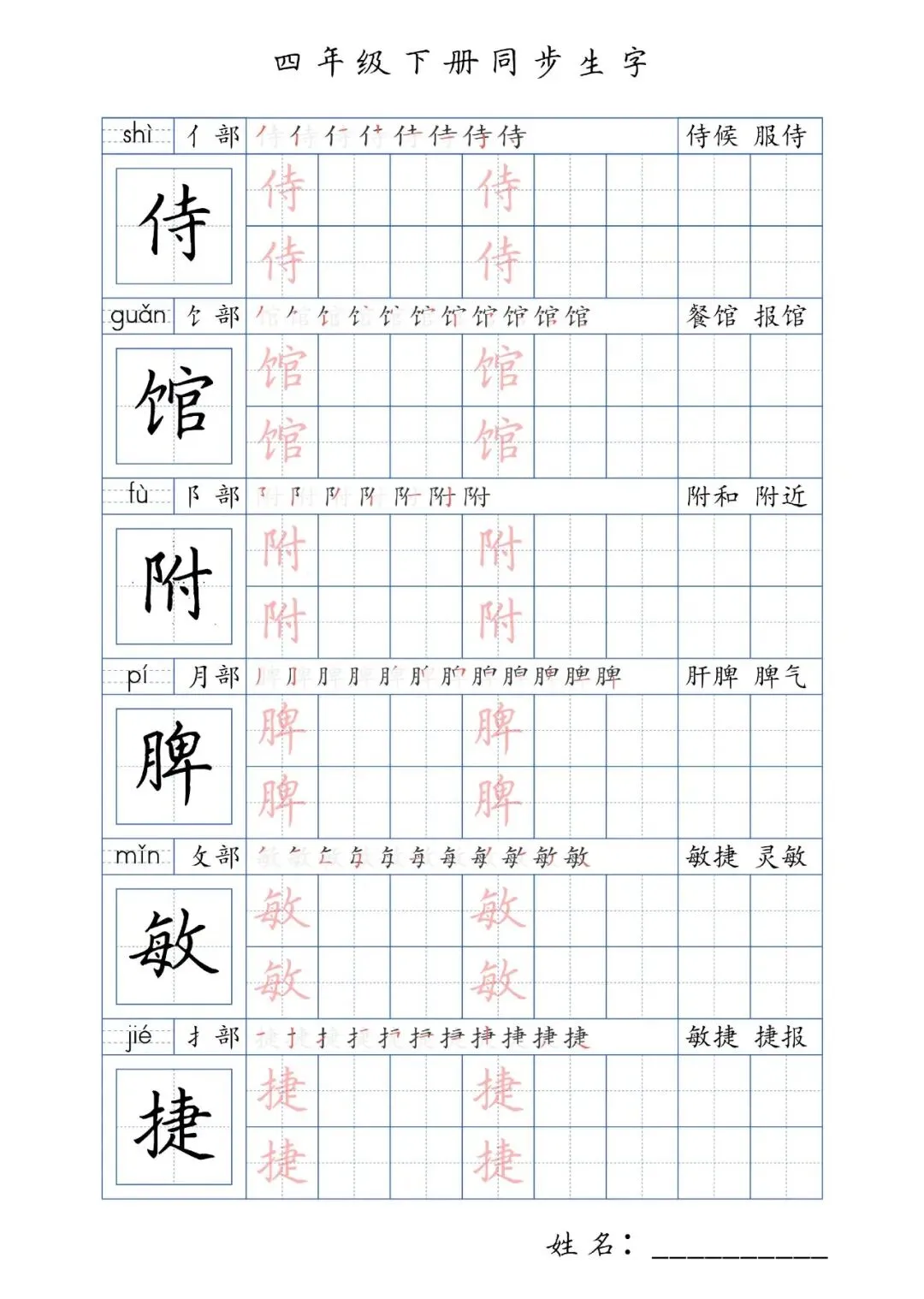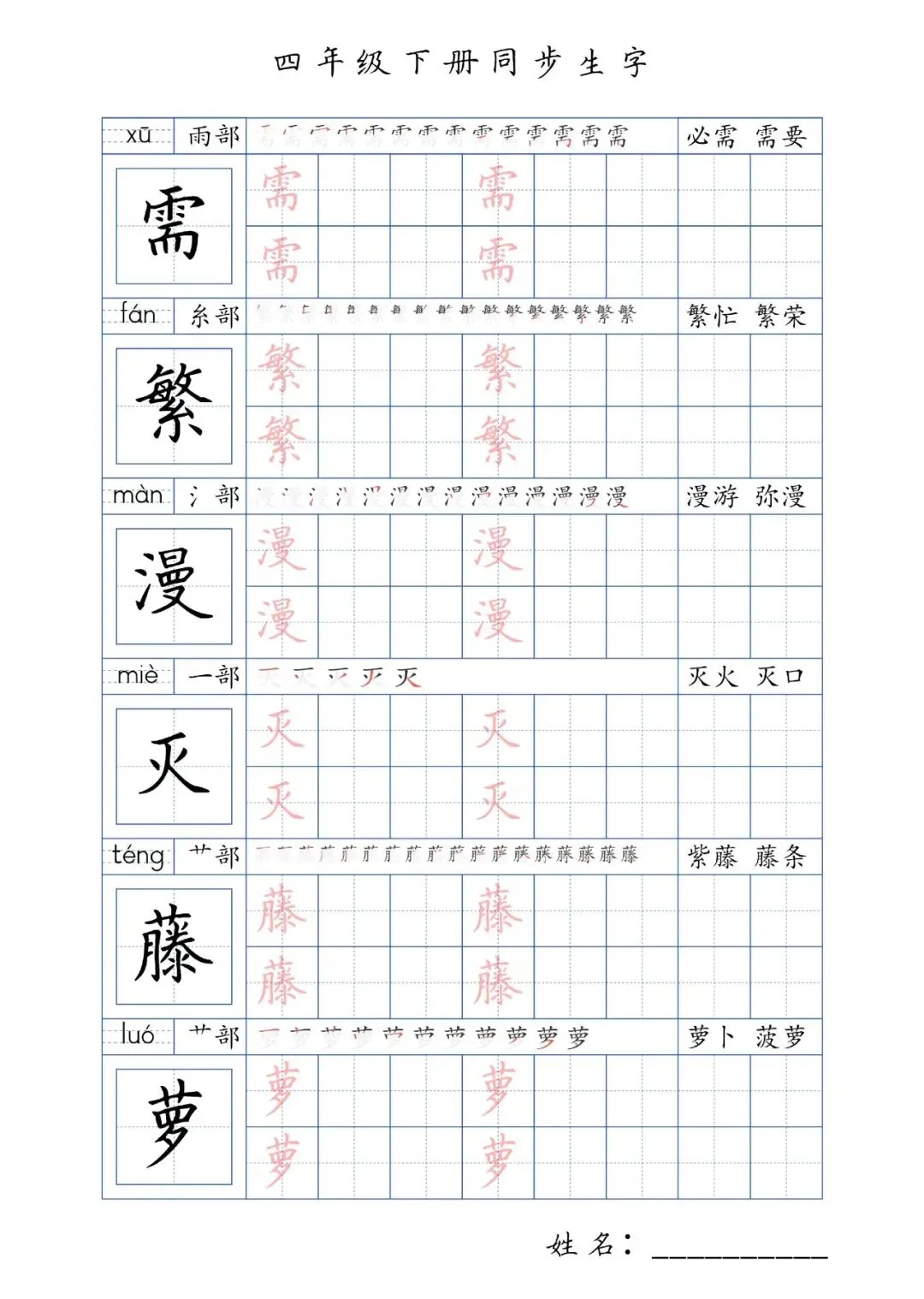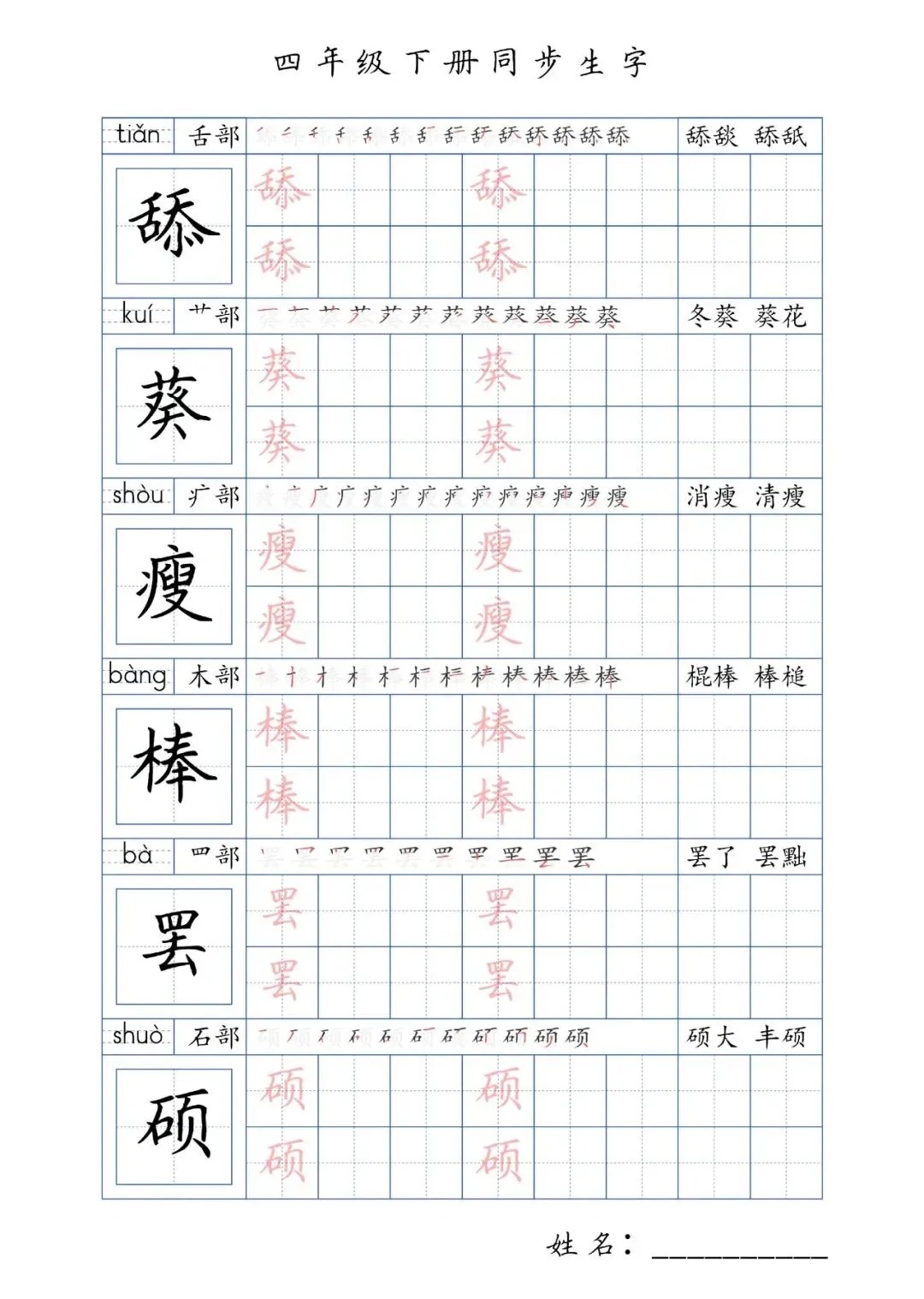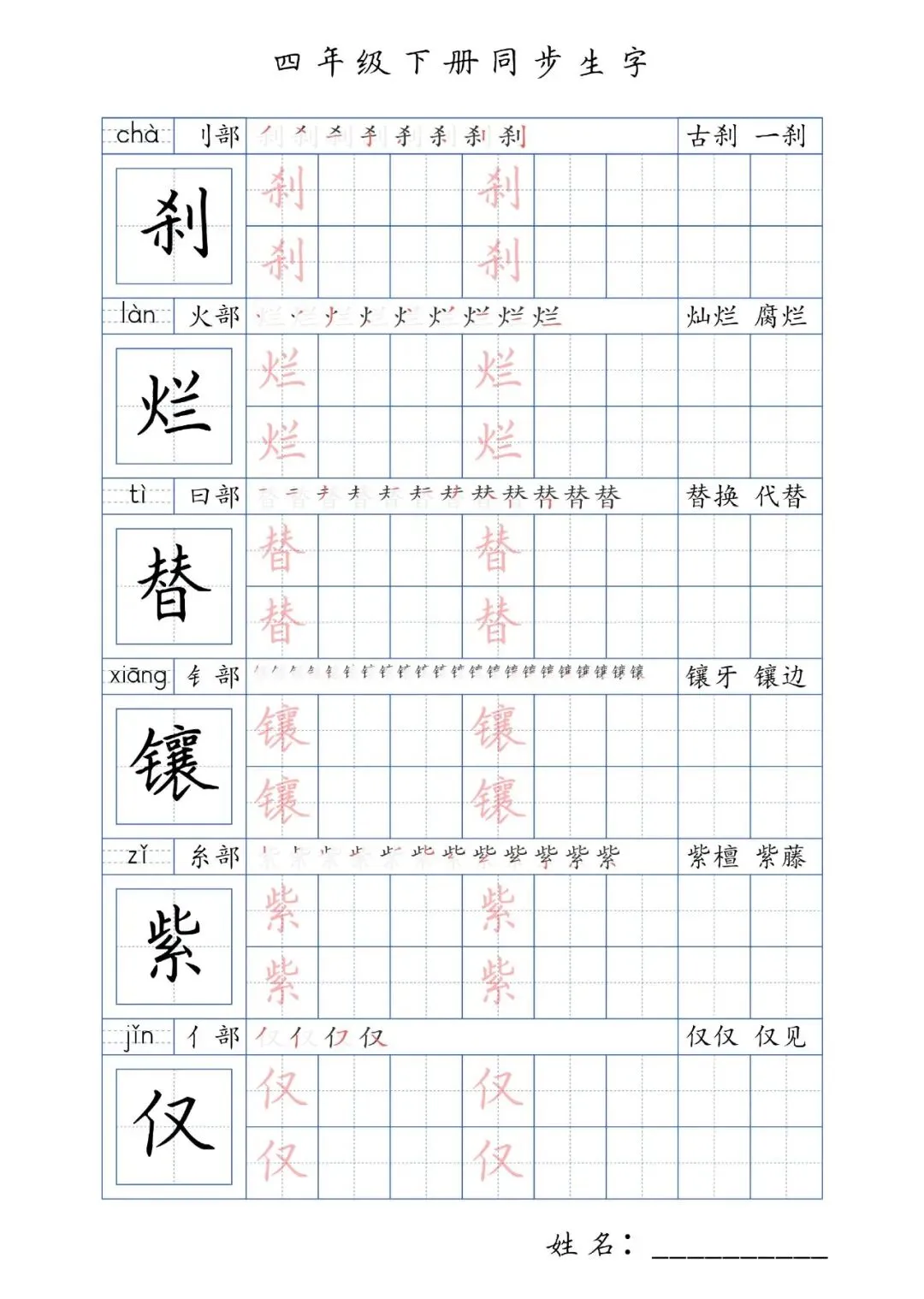 同步生字四年级下册,PDF免费下载