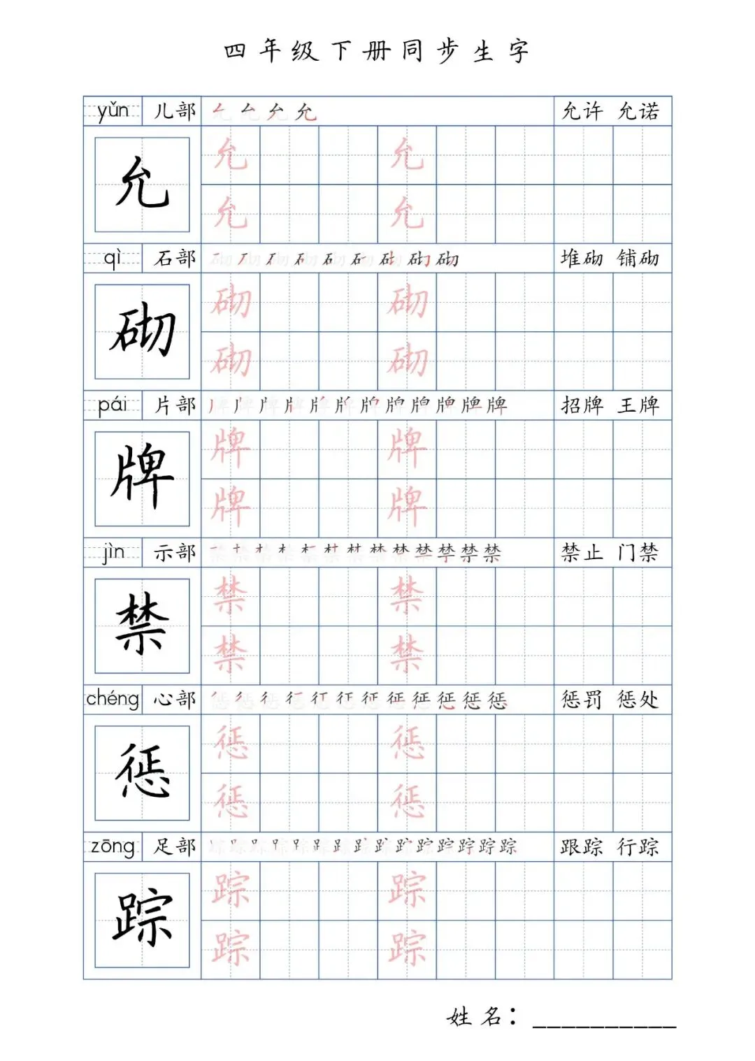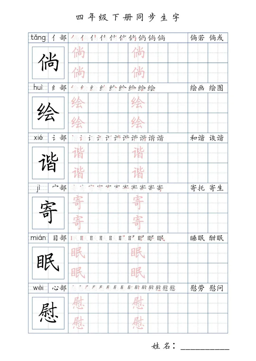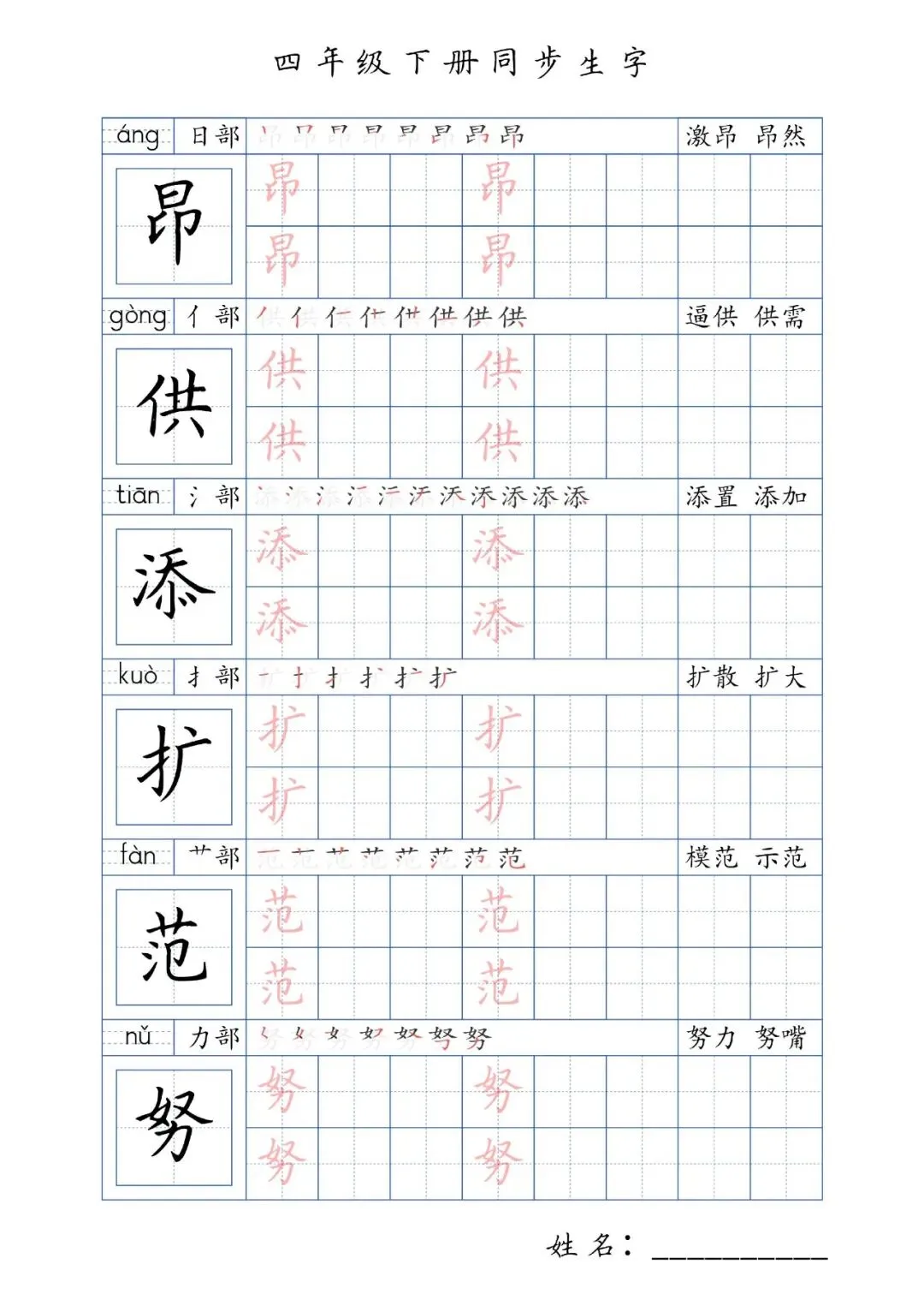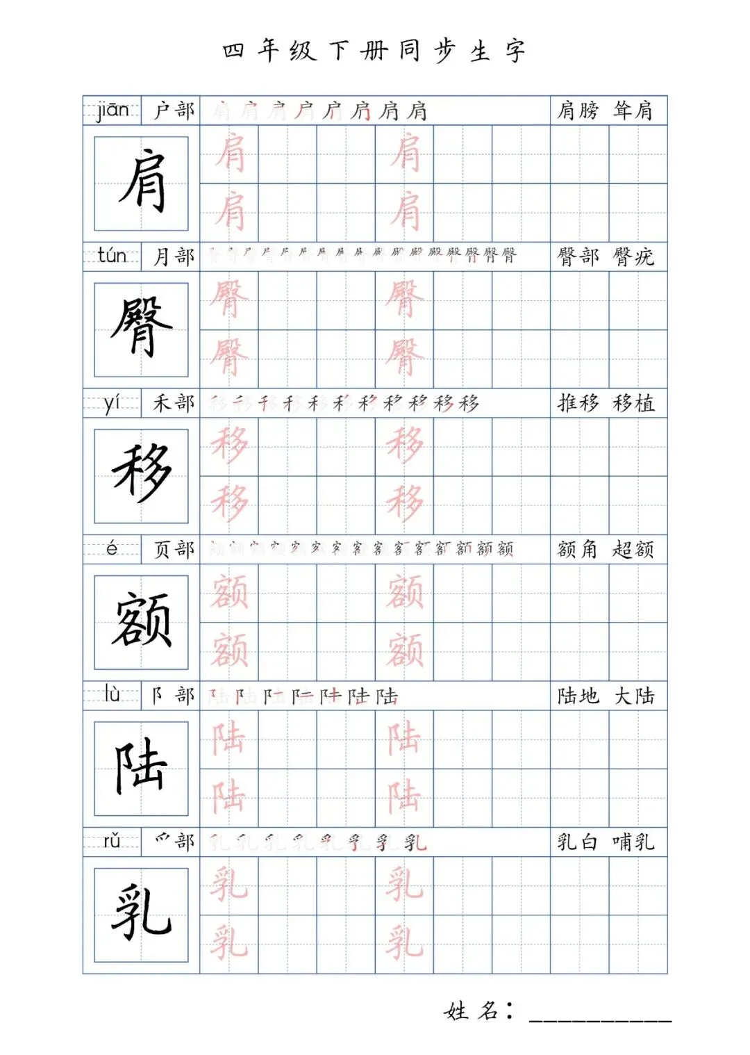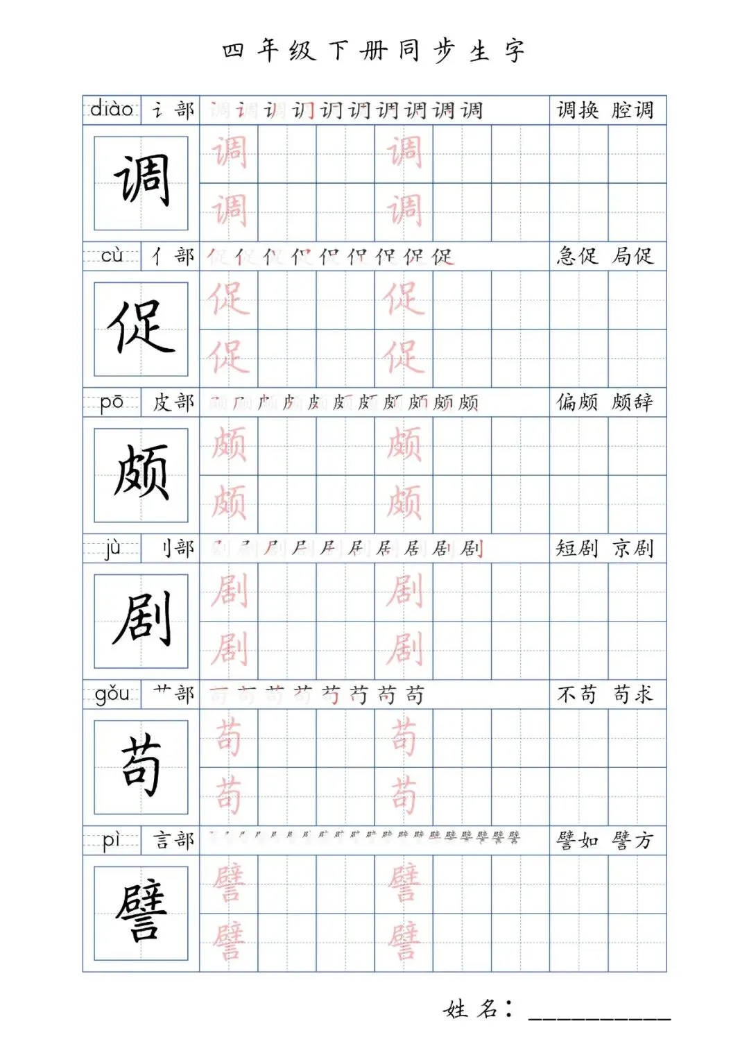 同步生字四年级下册,PDF免费下载