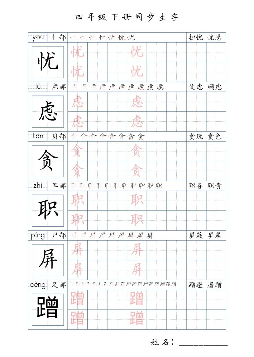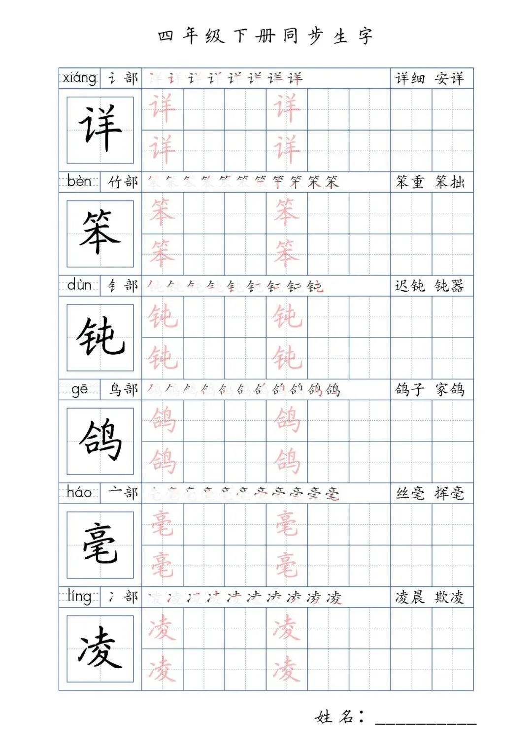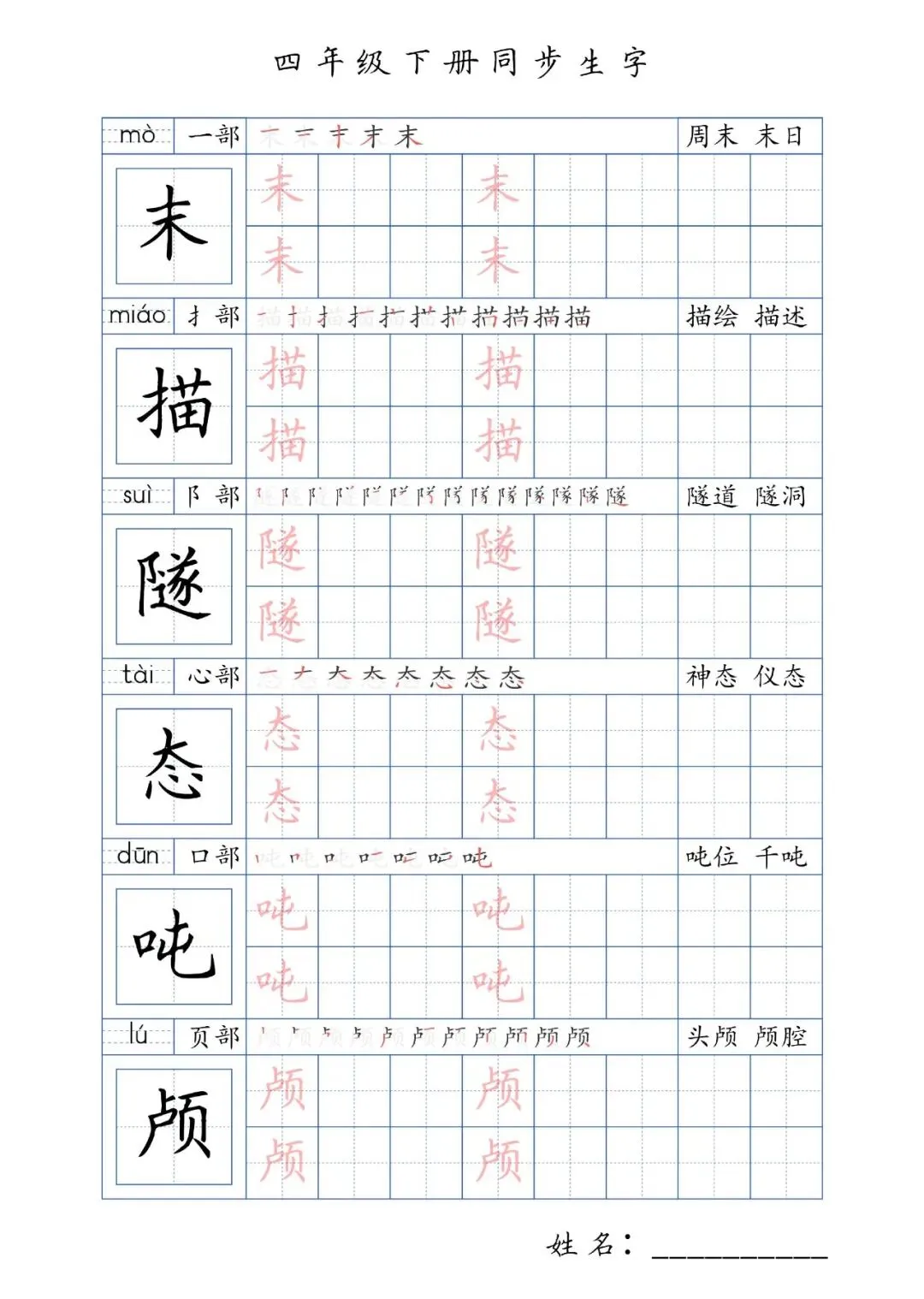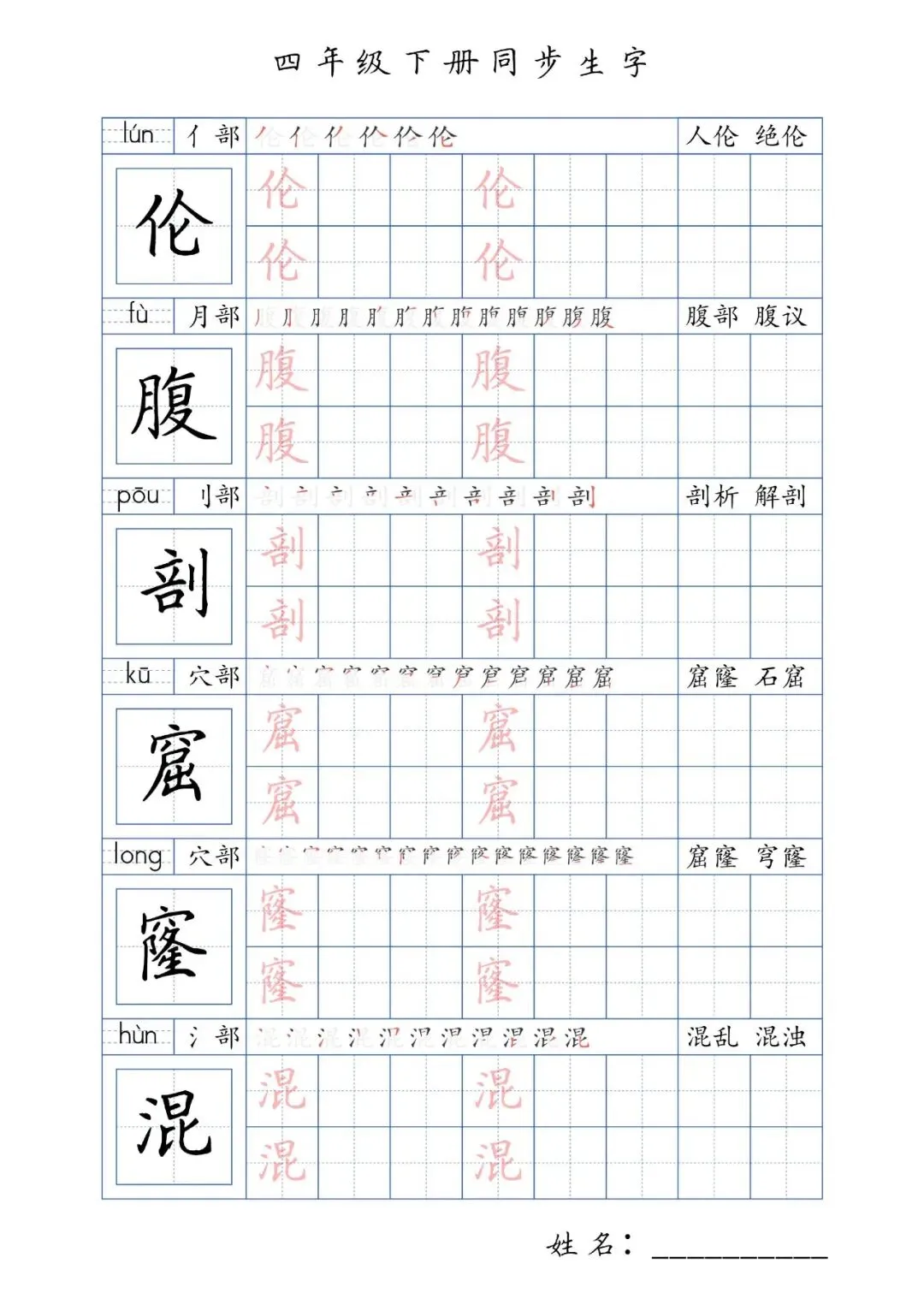同步生字四年级下册,PDF免费下载