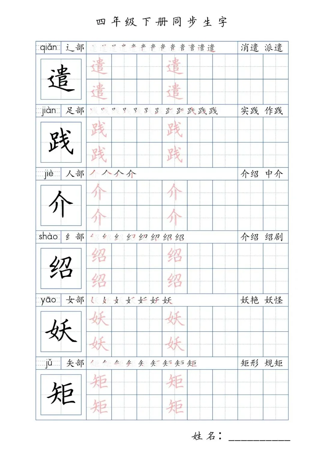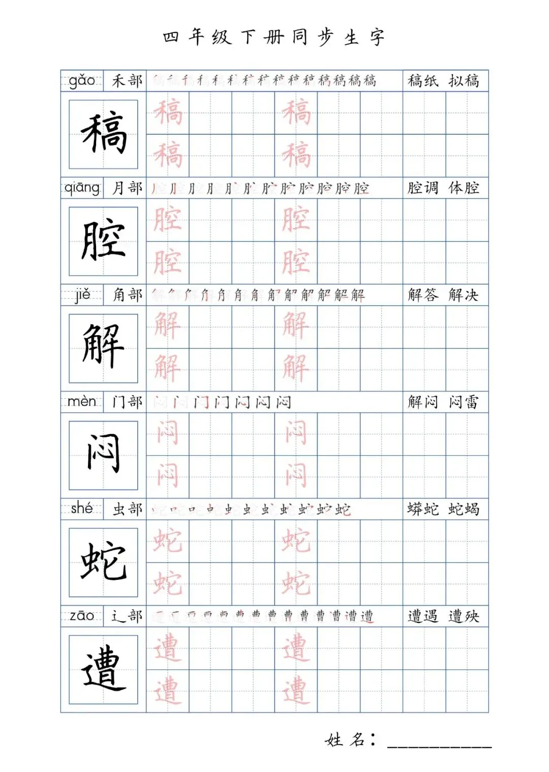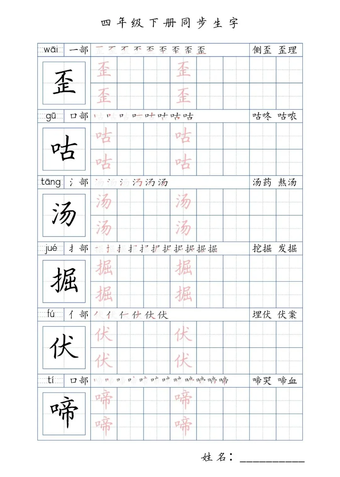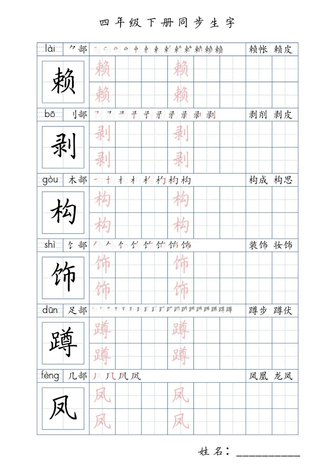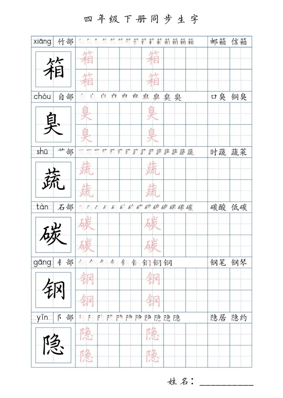 同步生字四年级下册,PDF免费下载